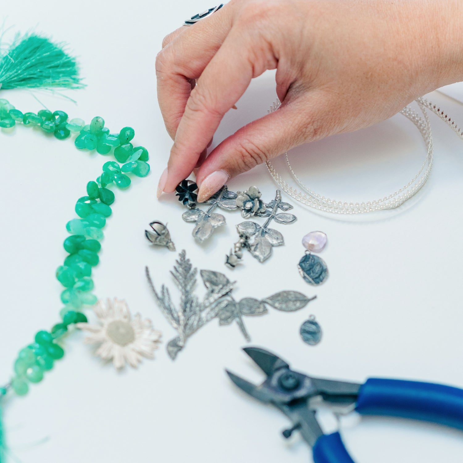 Now, by using basic metalsmithing techniques such as sawing, hammering and soldering, I create jewelry that combines glass, precious metals, gemstones and hand casted botanicals.