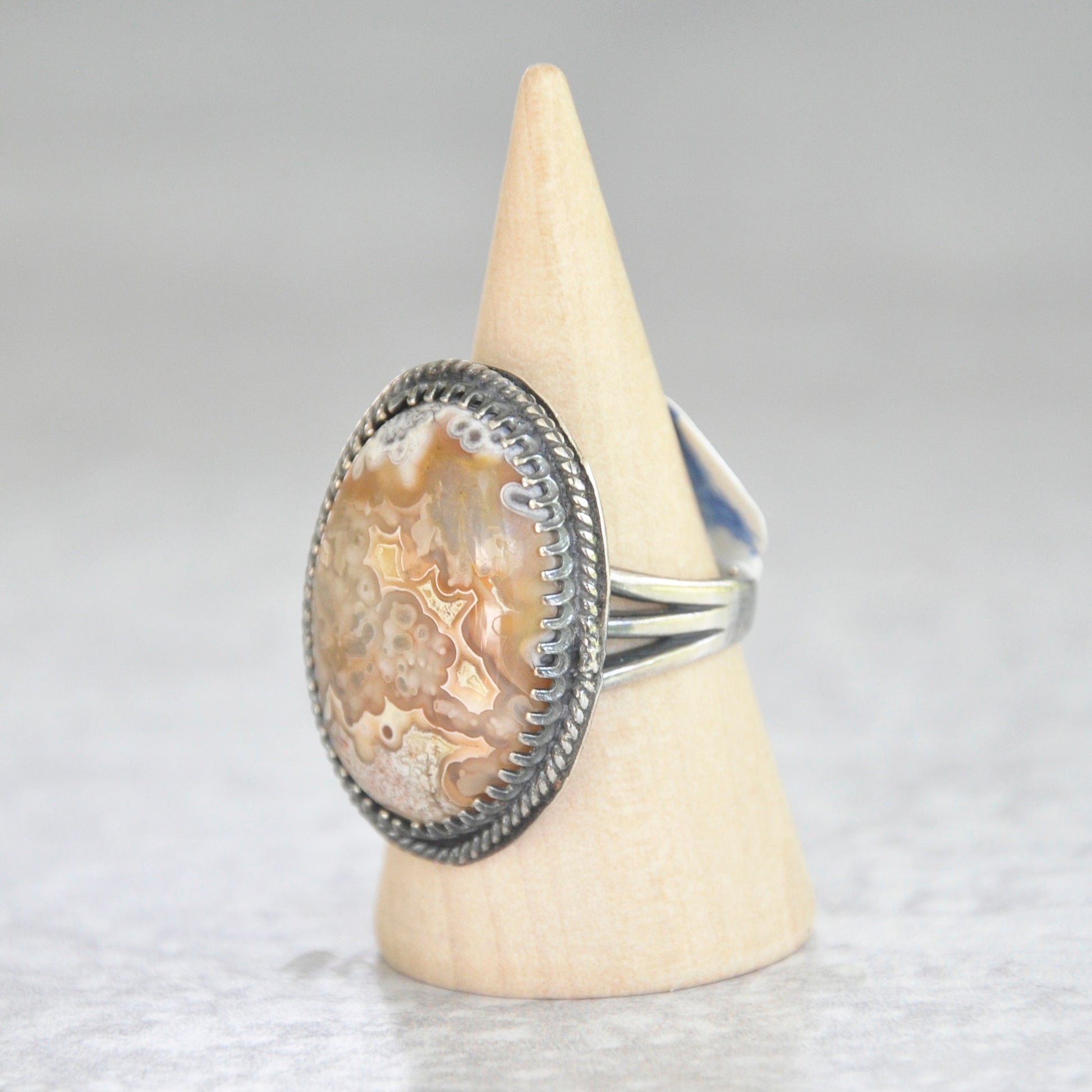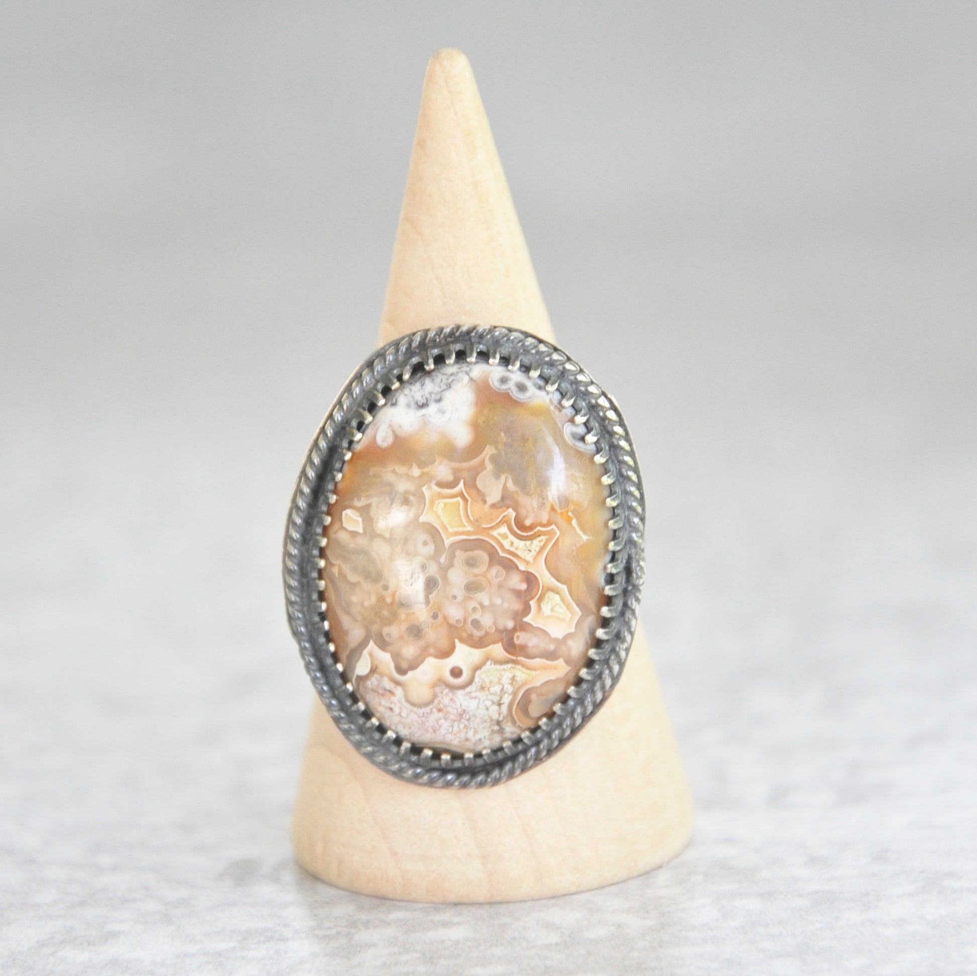 An agate is set in sterling silver is patinaed for a weathered + antiqued look.