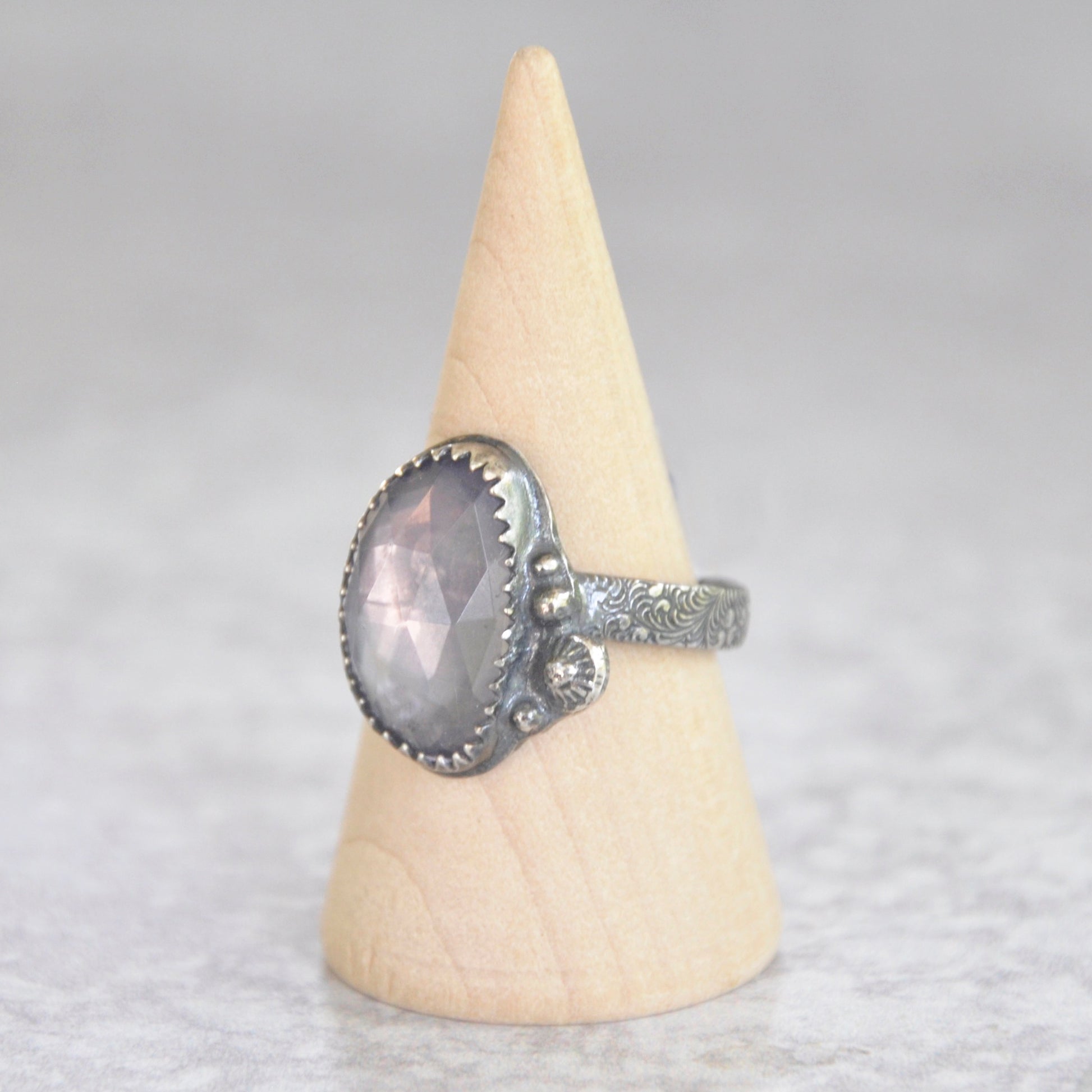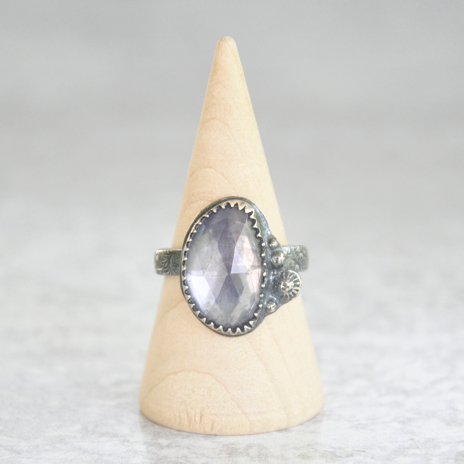A faceted light amethyst is set in sterling silver is patinaed for a weathered + antiqued look.