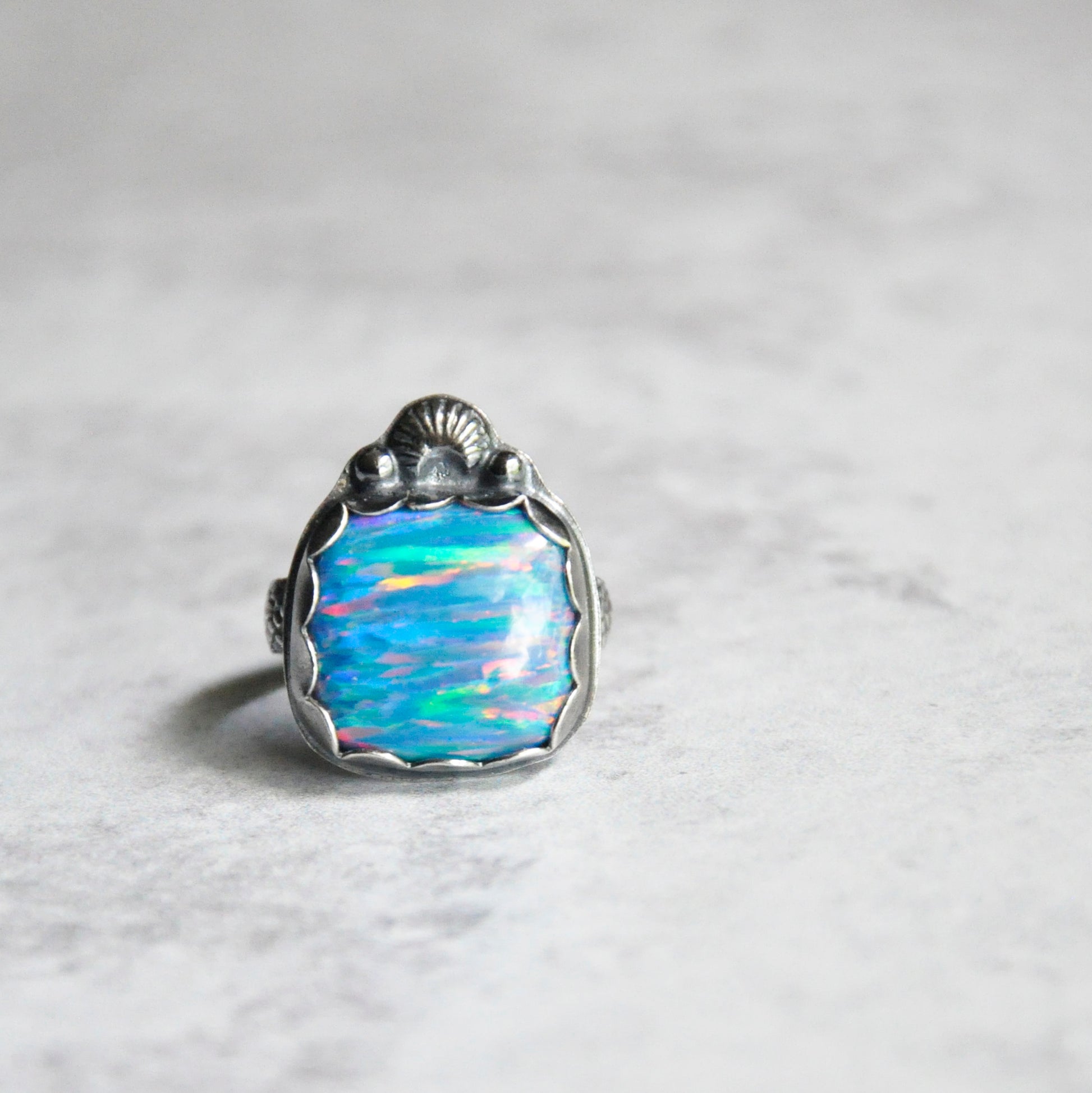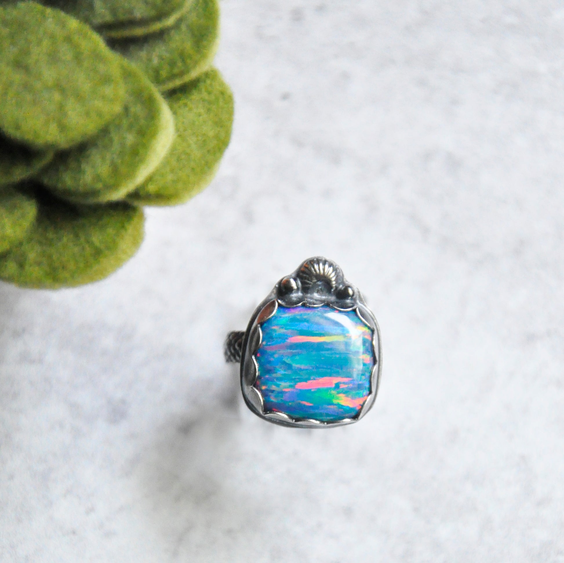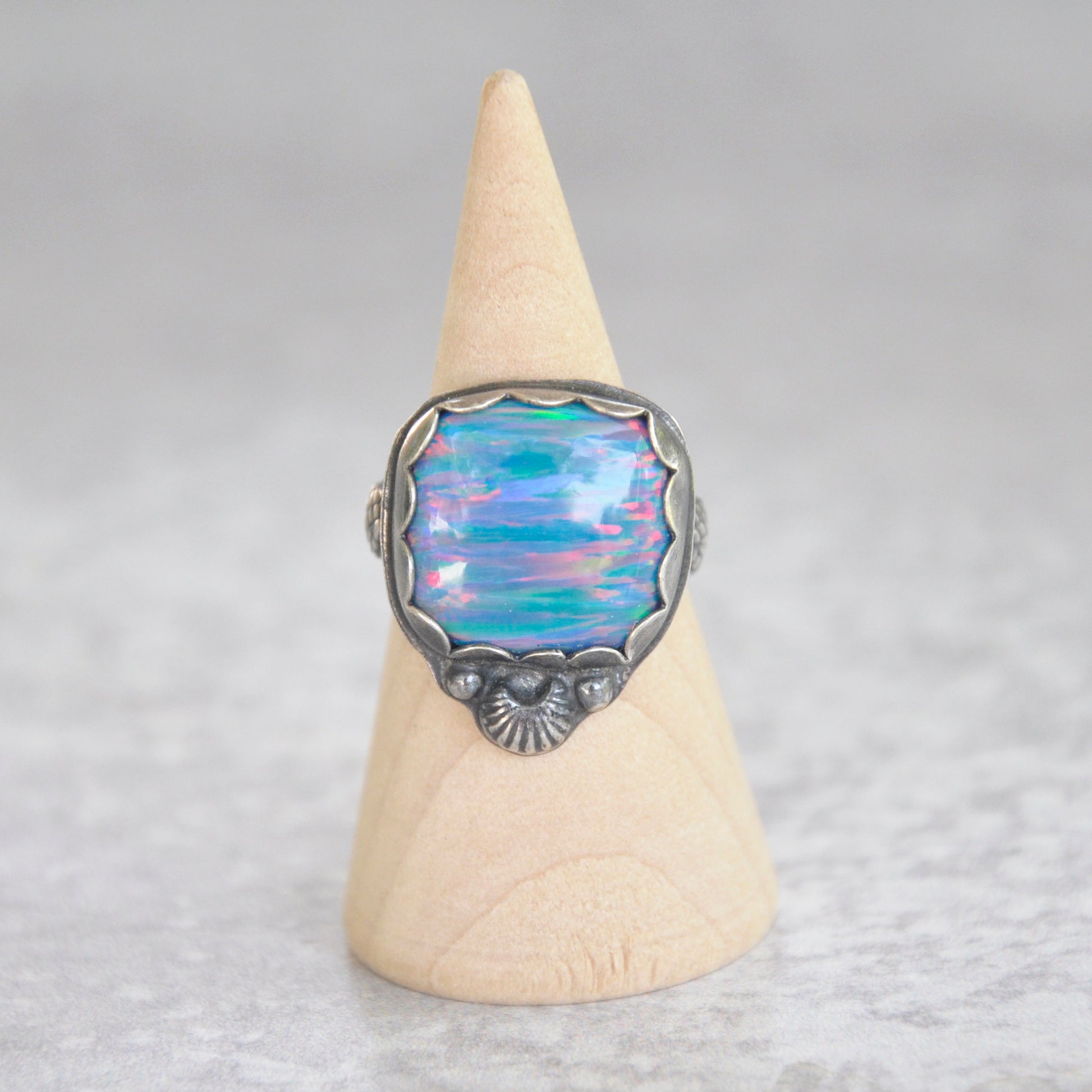 Aura opal is a type of synthetic opal that has amazing flash. The sterling silver is patinaed for a weathered + antiqued look. Set in an hand forged bezel.
