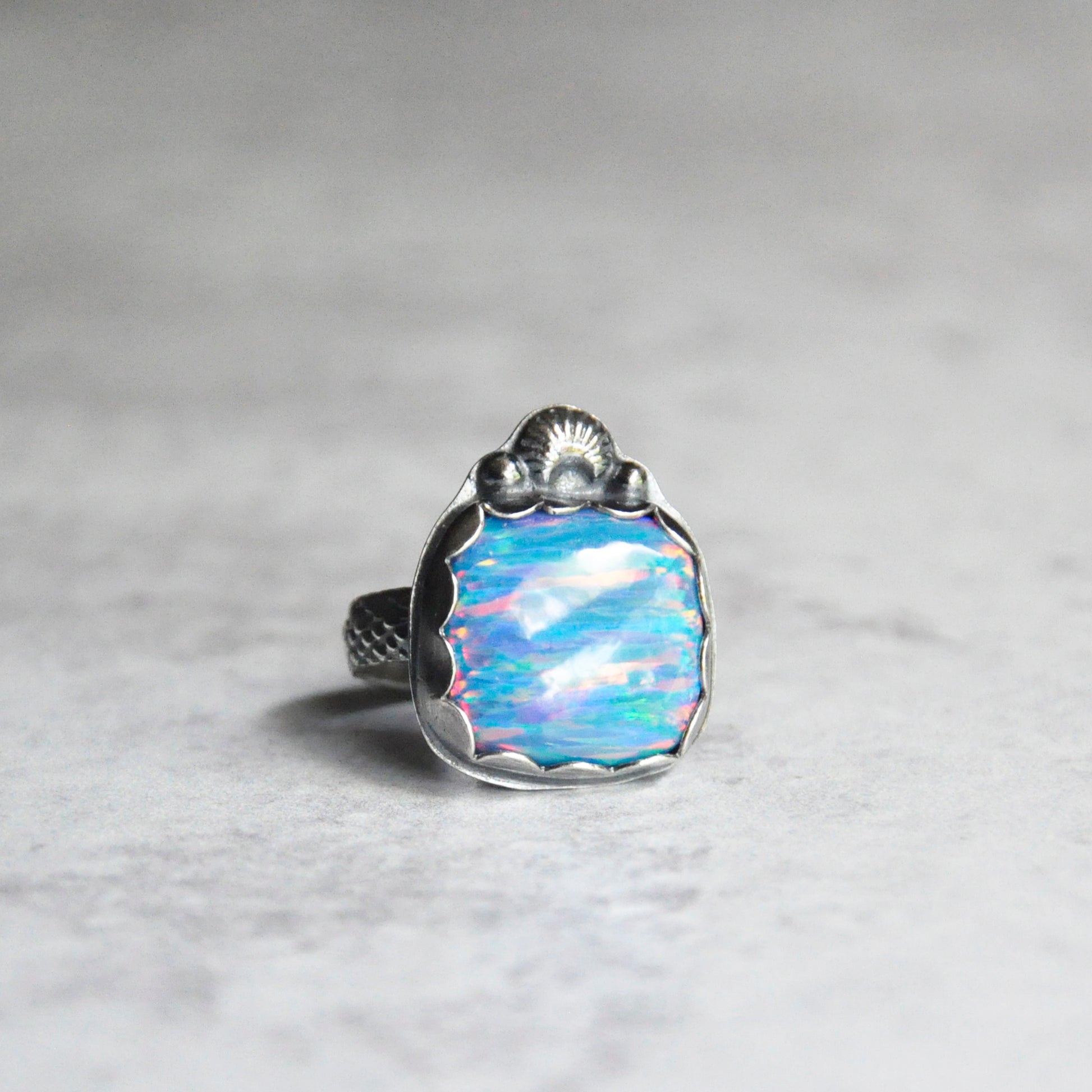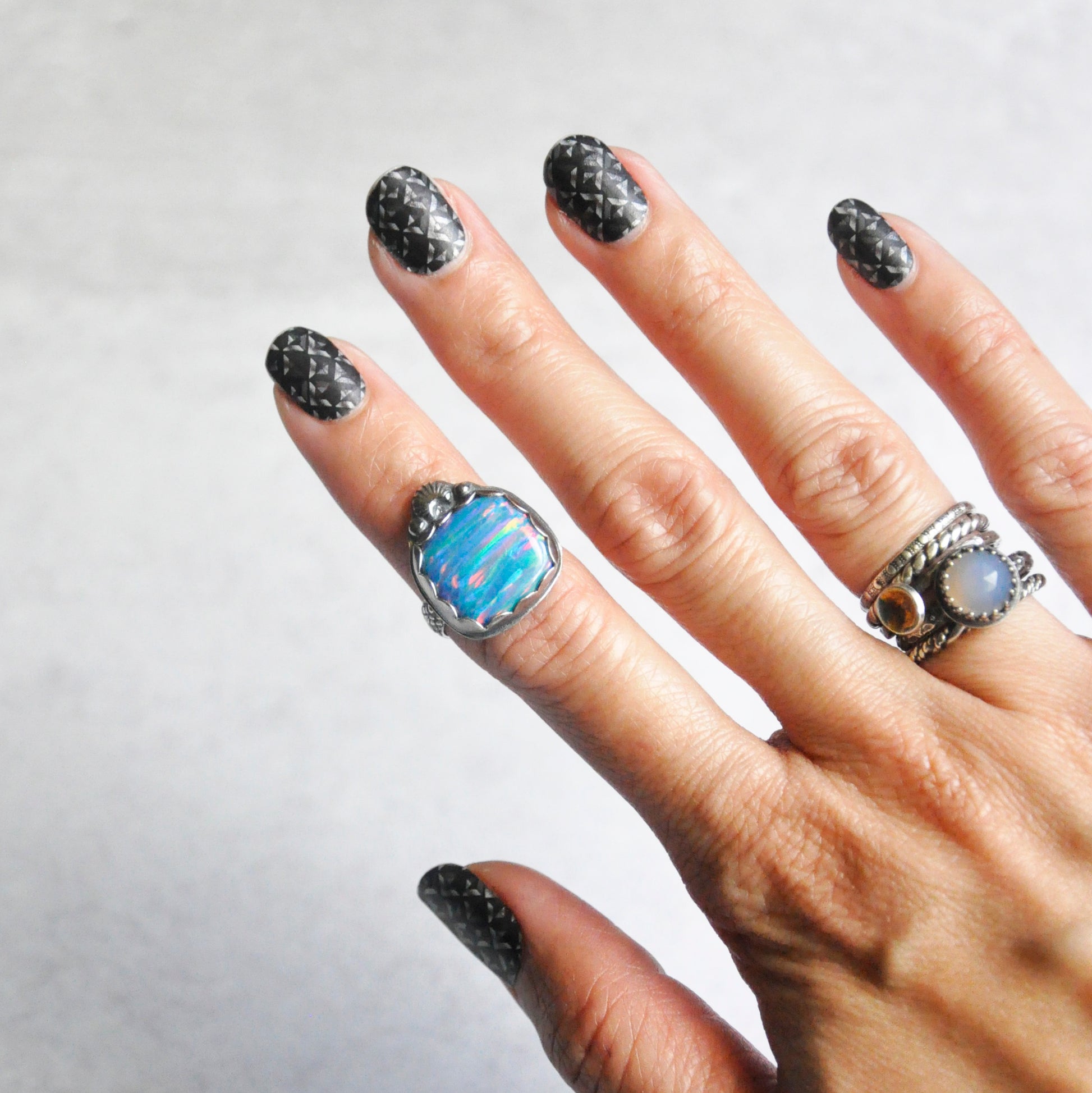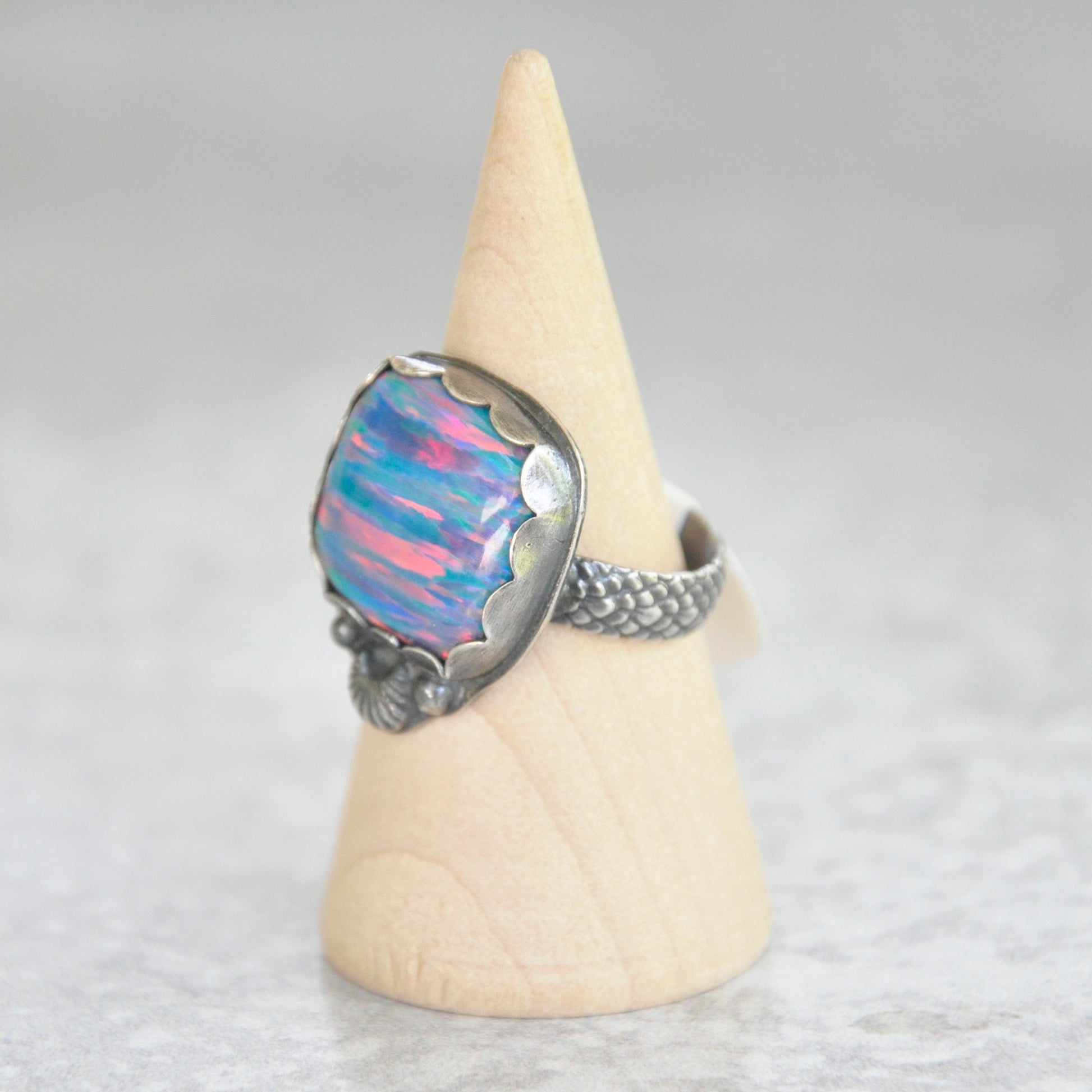 Aura opal is a type of synthetic opal that has amazing flash. The sterling silver is patinaed for a weathered + antiqued look. Set in an hand forged bezel.