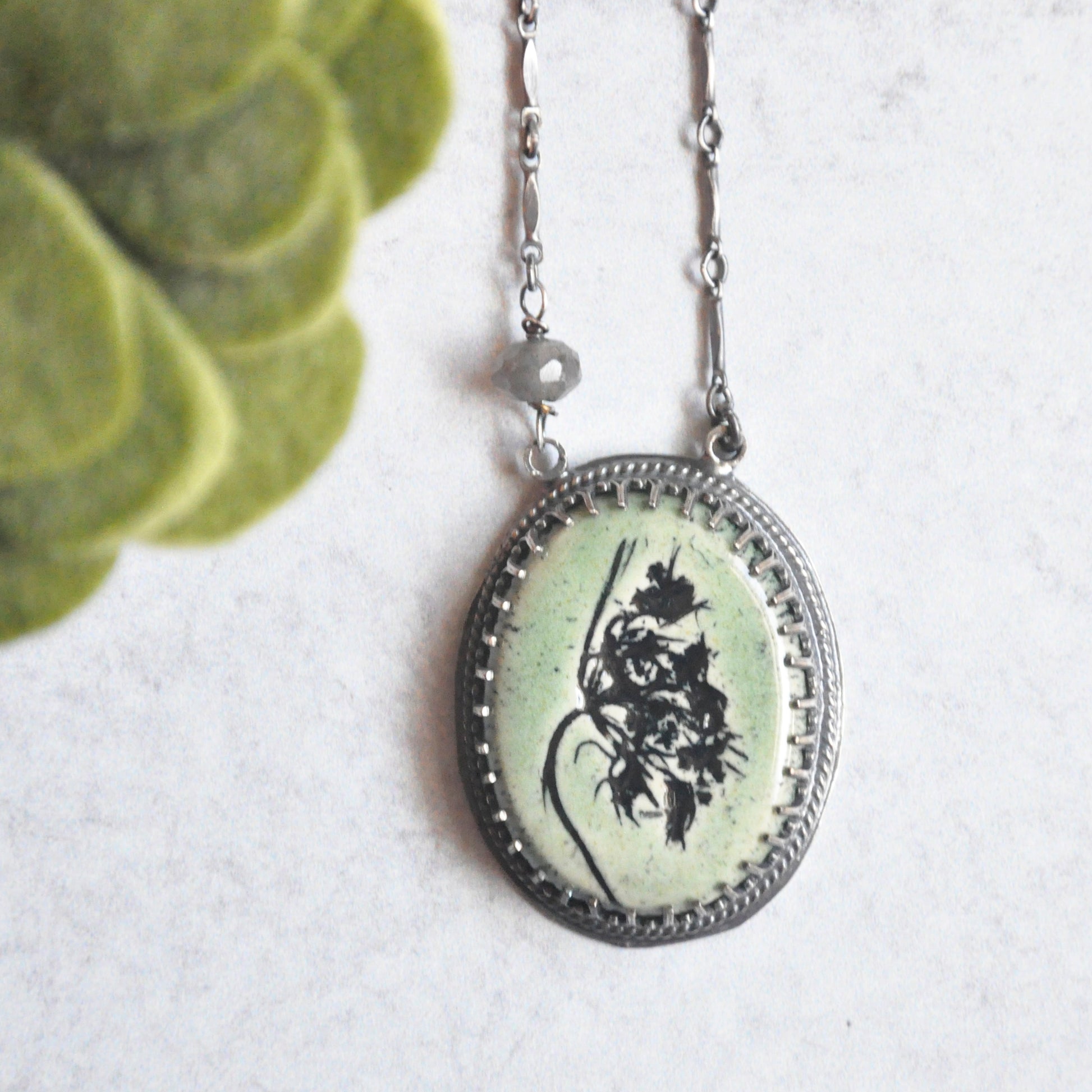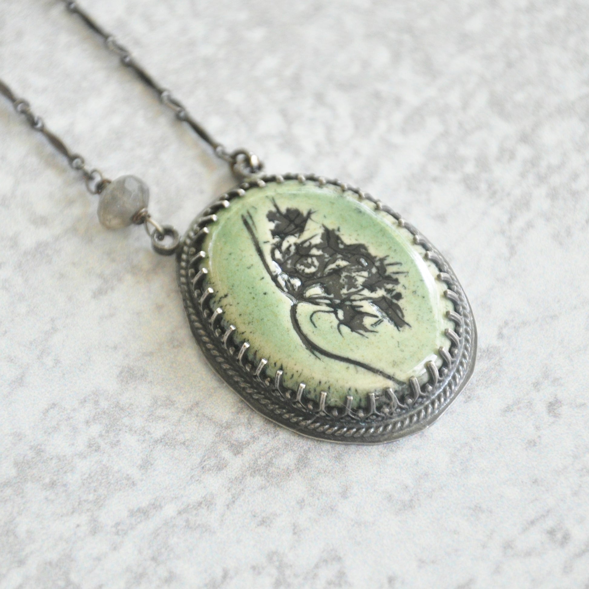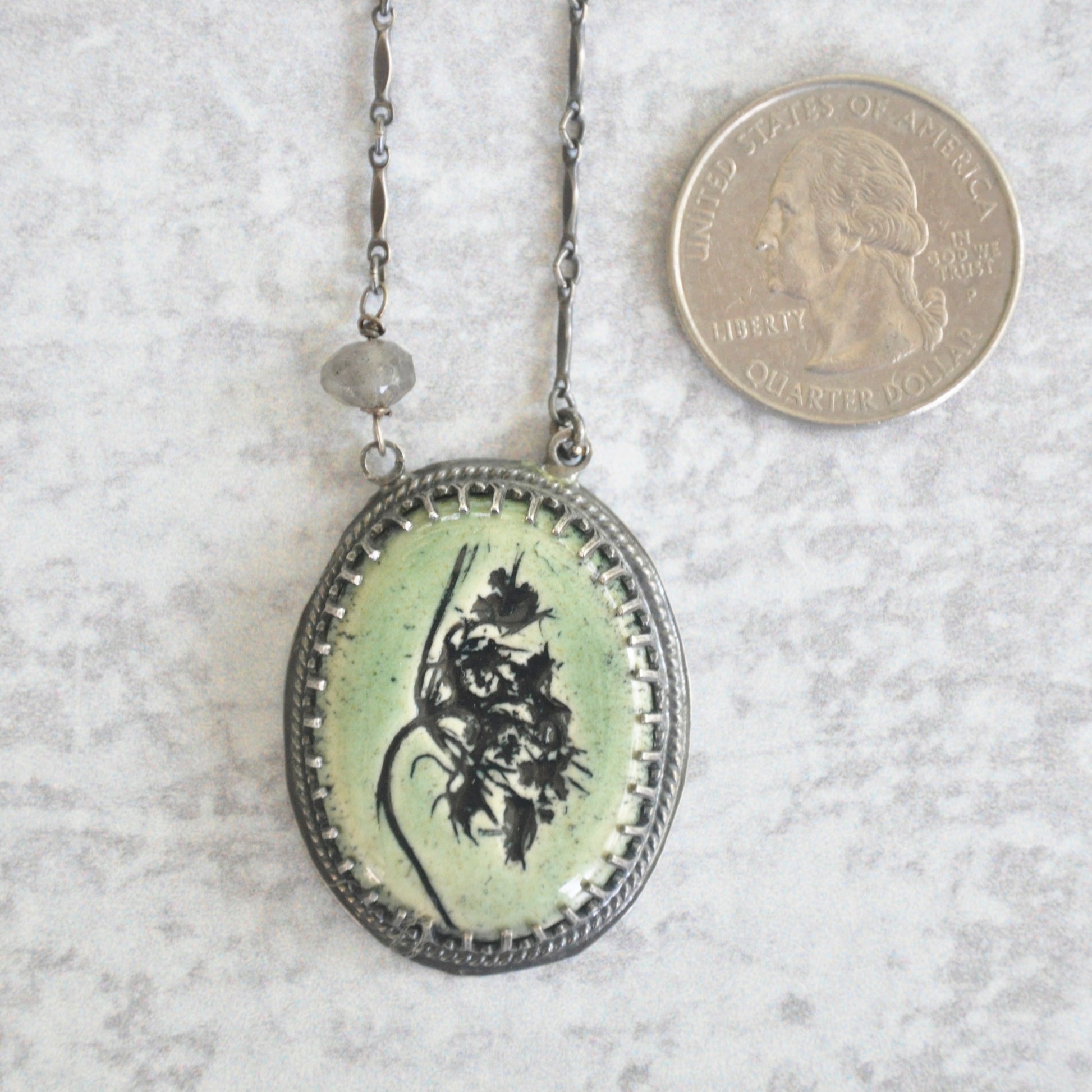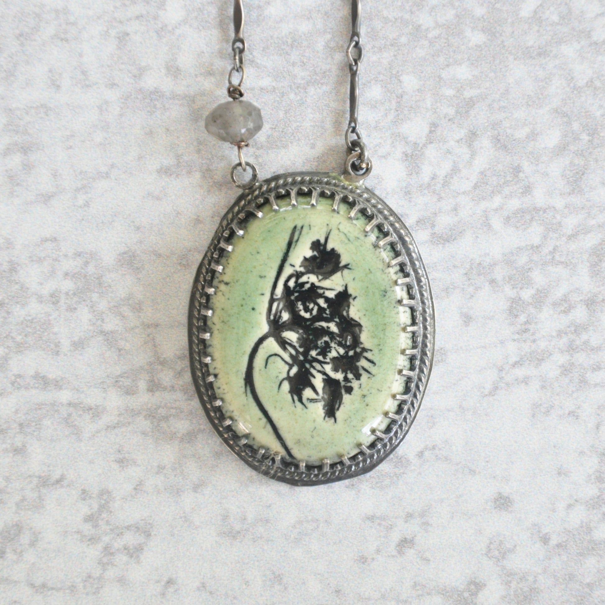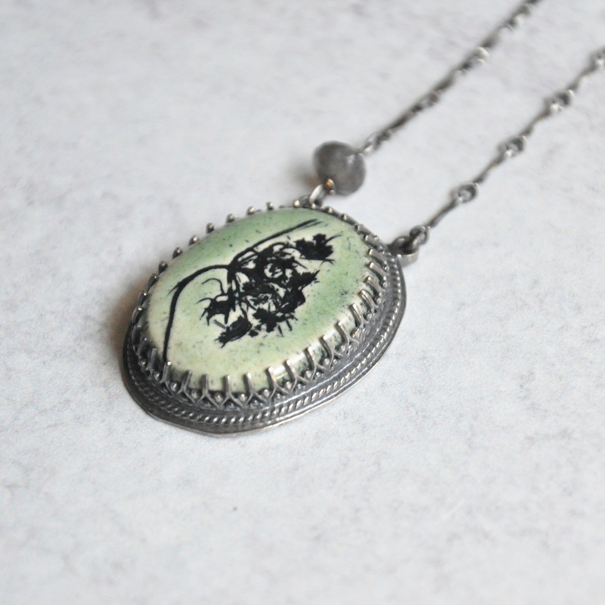 A real botanical element is imprinted in a ceramic cab and accented with a tiny labradorite bead. Sterling silver is patinaed for a weathered + antiqued look. Set in an hand forged deco bezel.