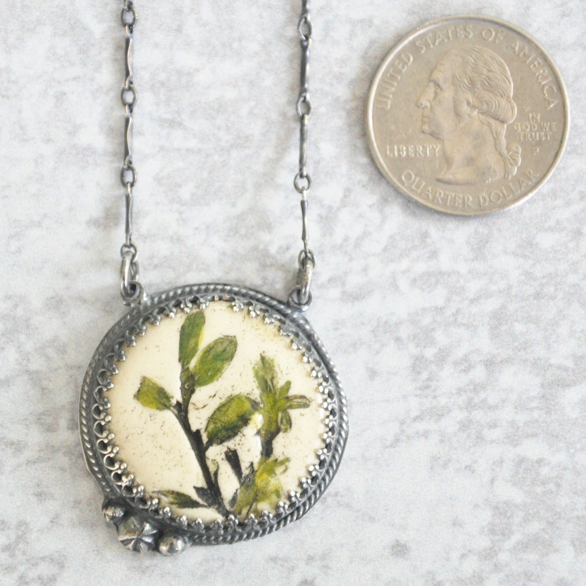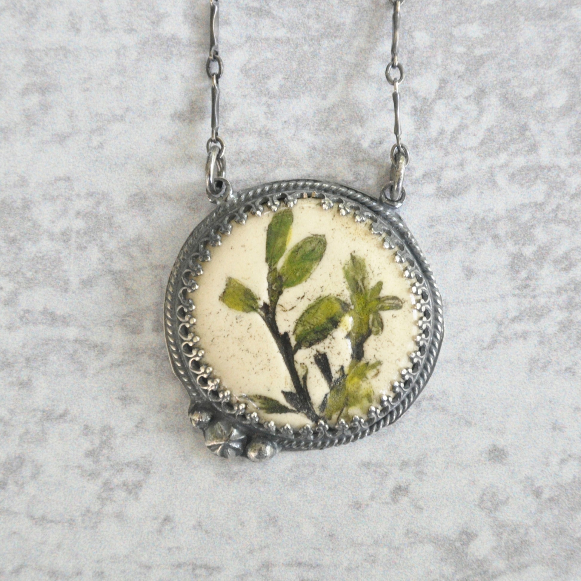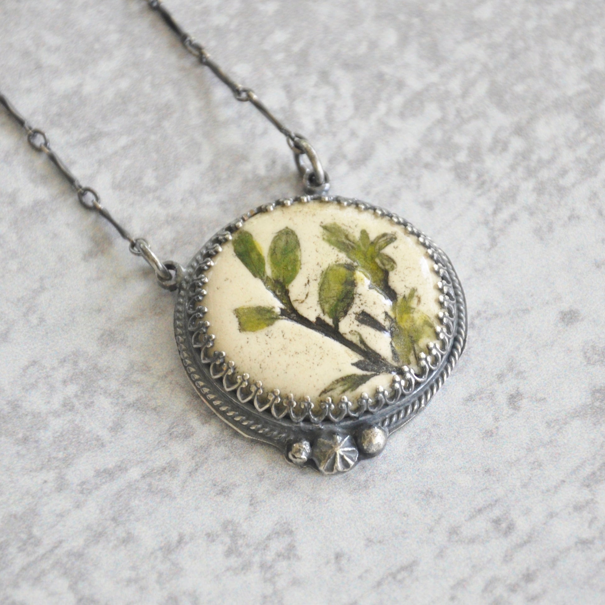 A real botanical element is imprinted in a ceramic cab and accented with a tiny labradorite bead. Sterling silver is patinaed for a weathered + antiqued look. Set in an hand forged deco bezel.