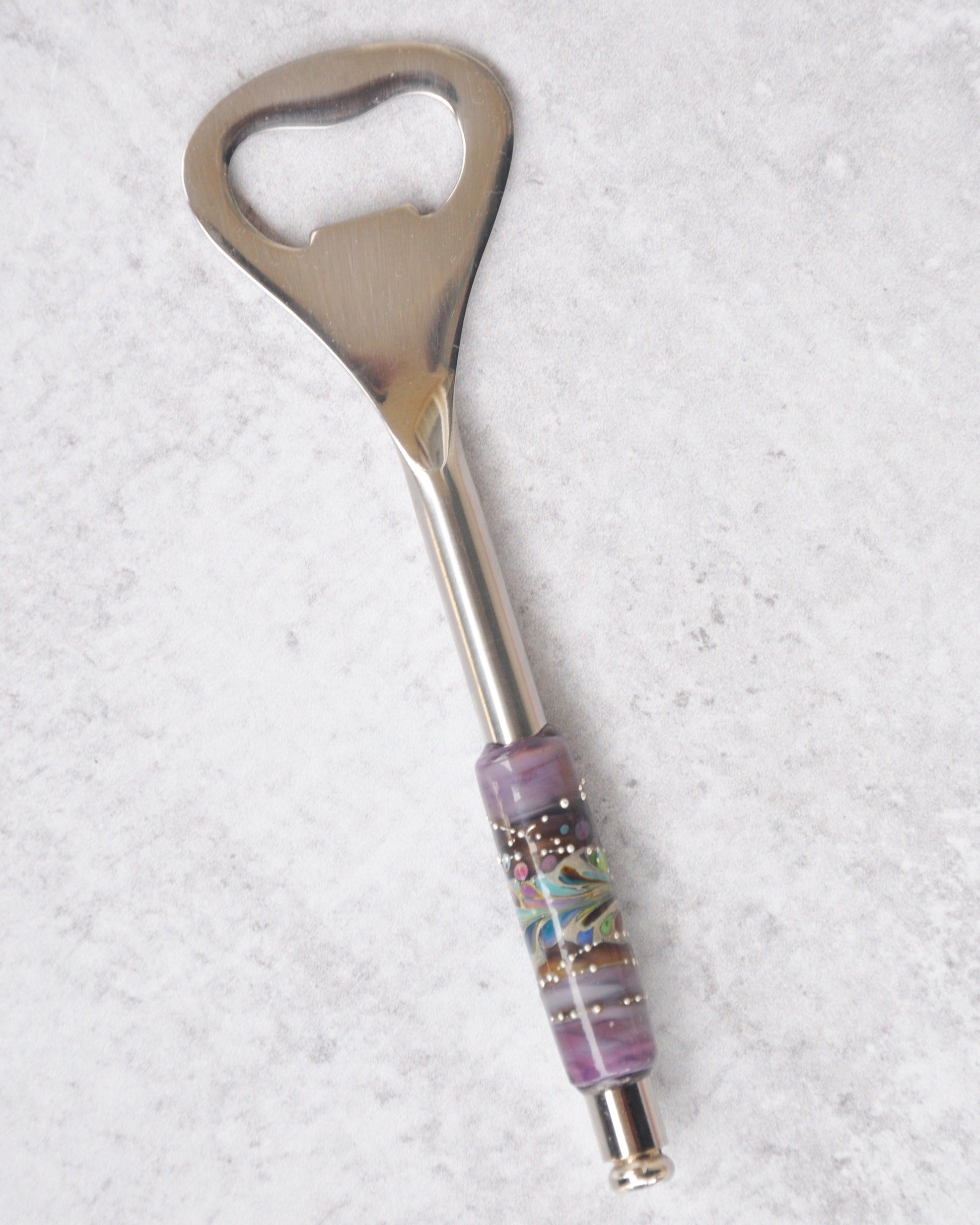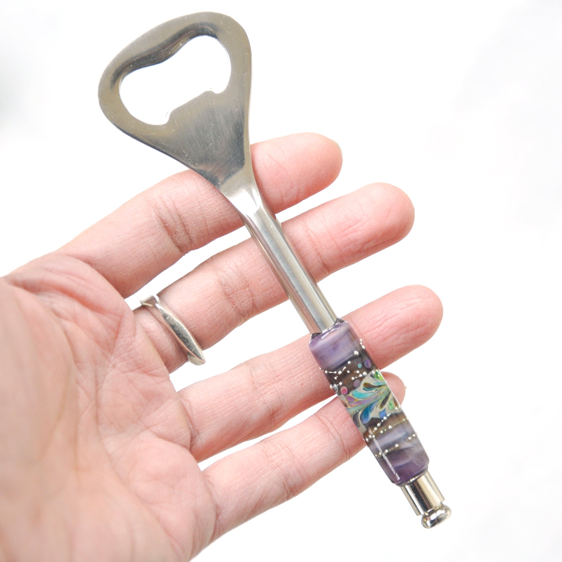 Handcrafted flamework glass was added to a stainless steel bottle opener to create a unique, one of a kind gift. The glass was made by me, in home studio, using a torch and high quality glass rods. Each piece of glass have been annealed to add hardness and durability.