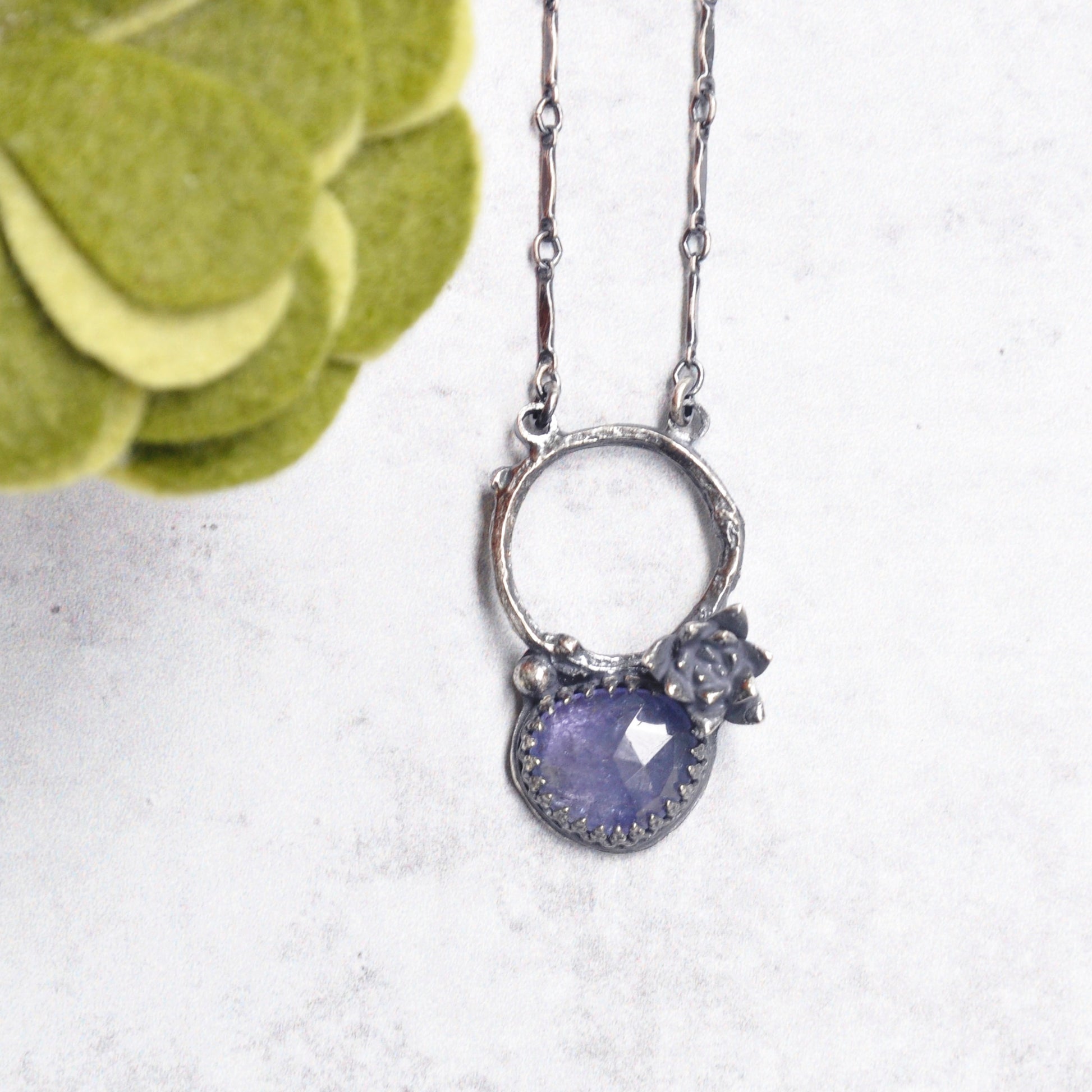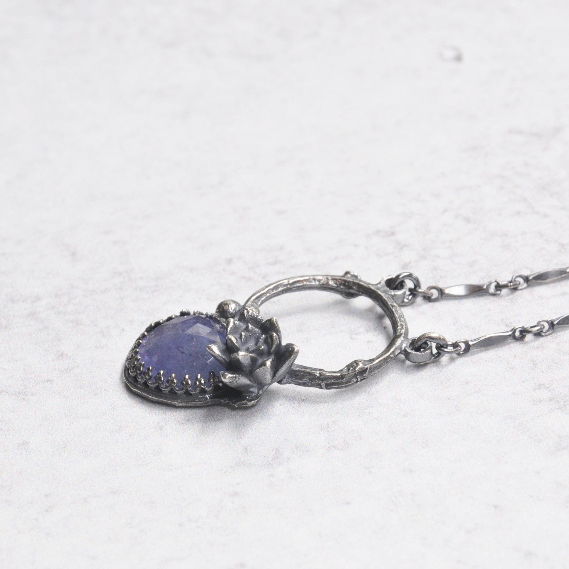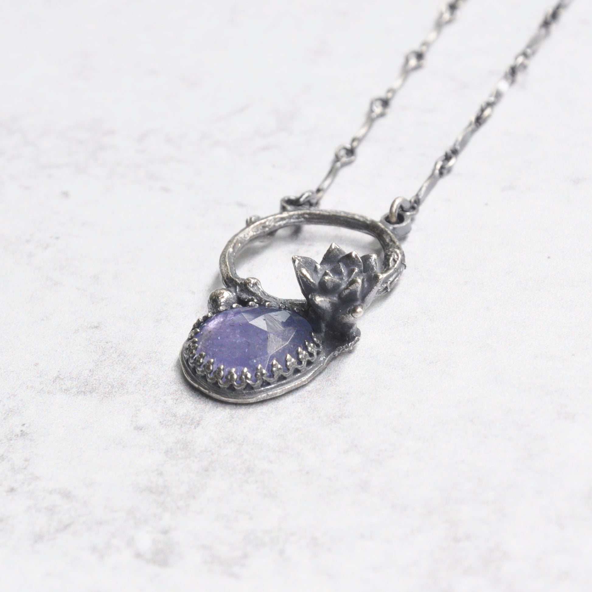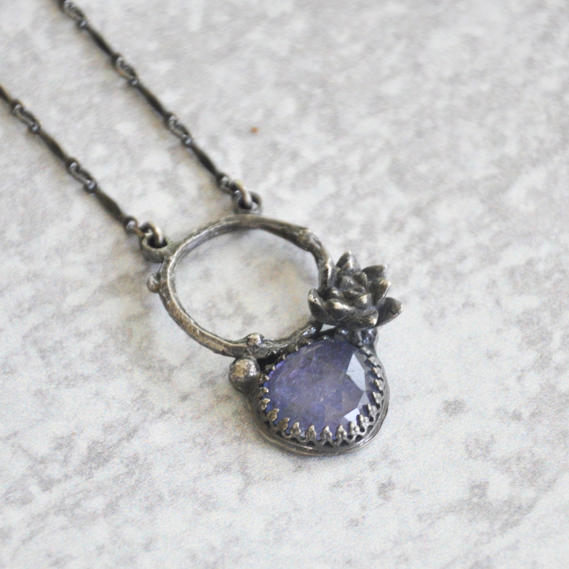 Highly faceted Tanzanite cab with a tiny casted succulent and a genuine casted twig. Sterling silver is patinaed for a weathered + antiqued look. Set in an hand forged bezel.