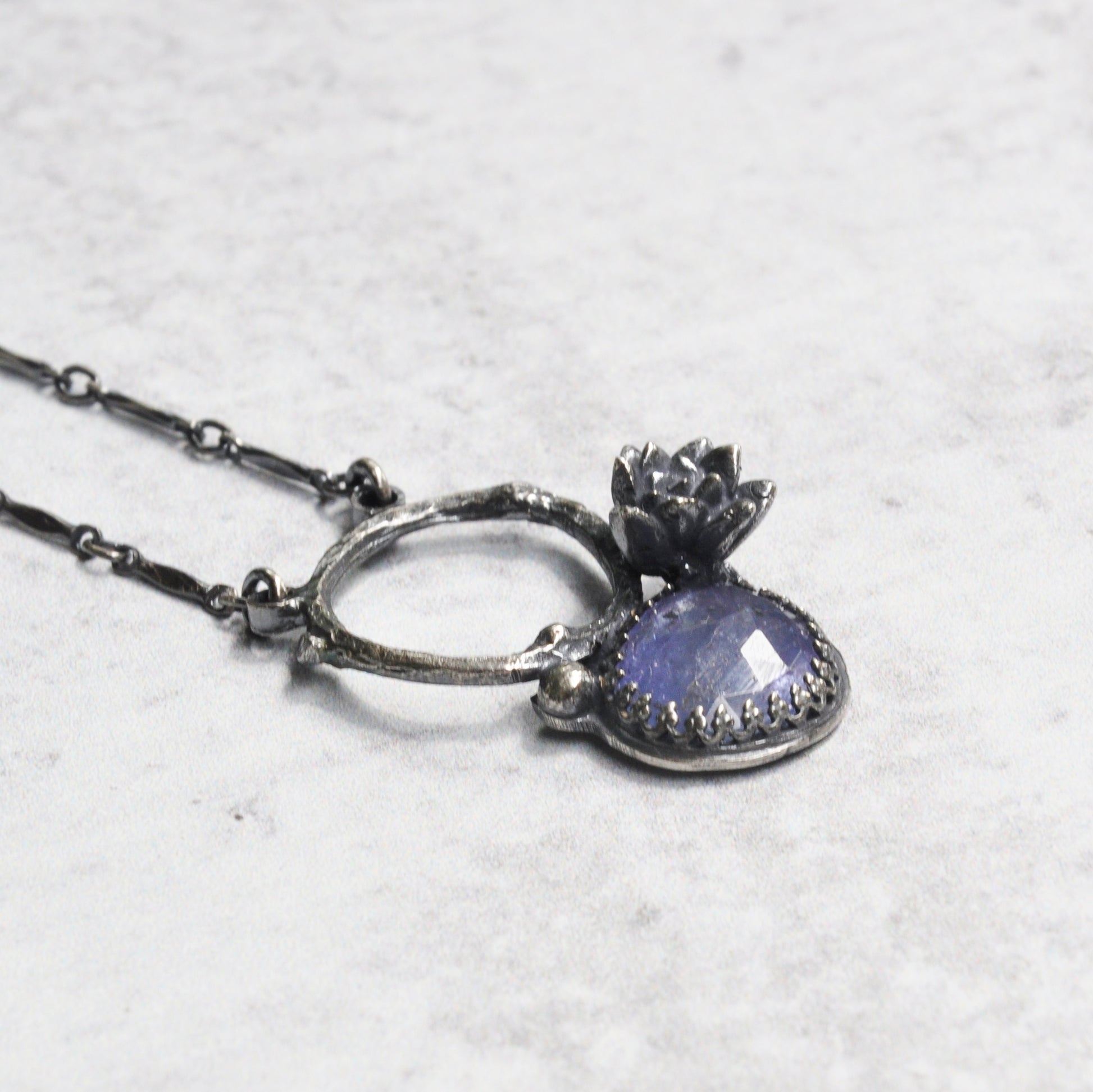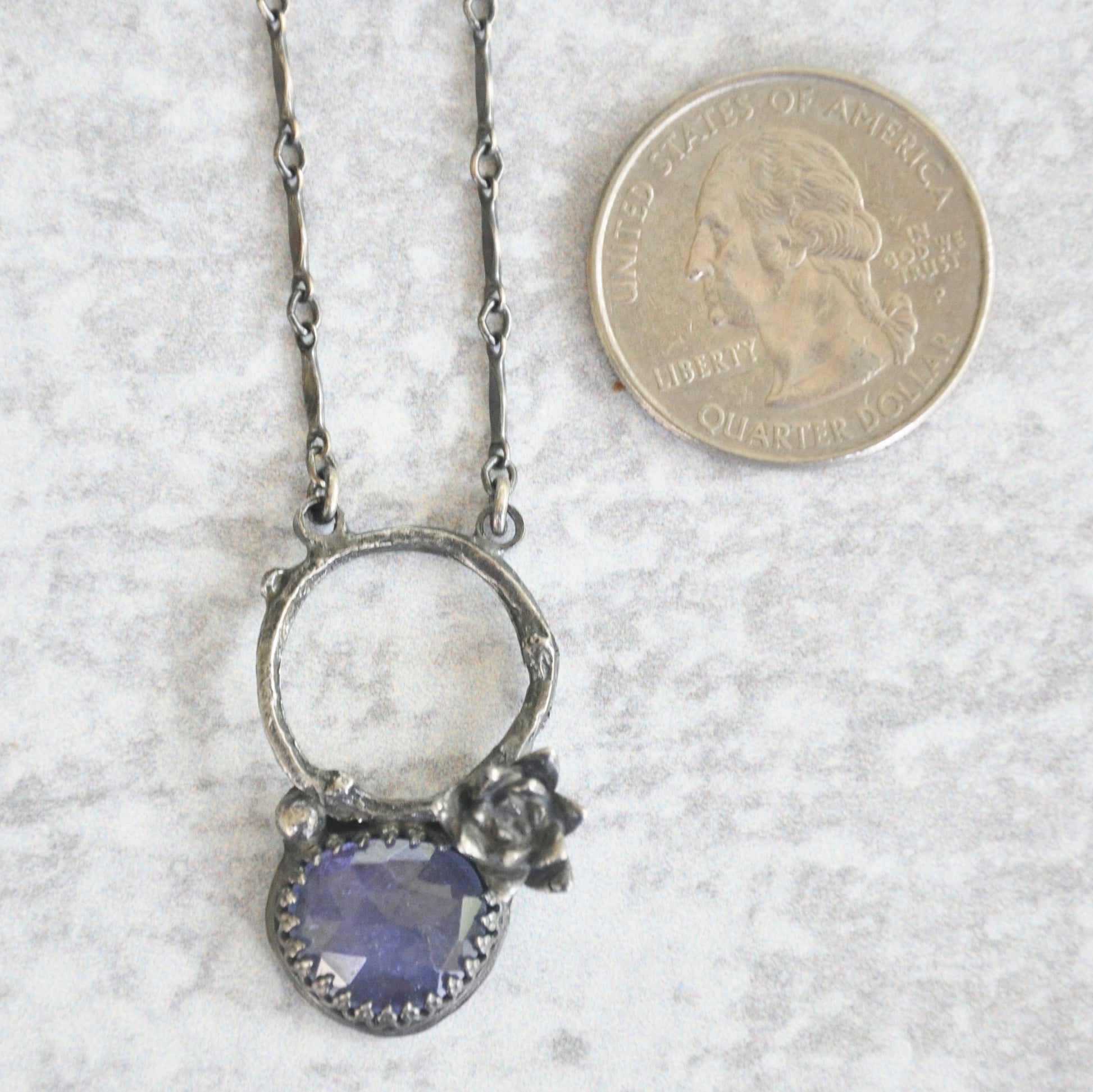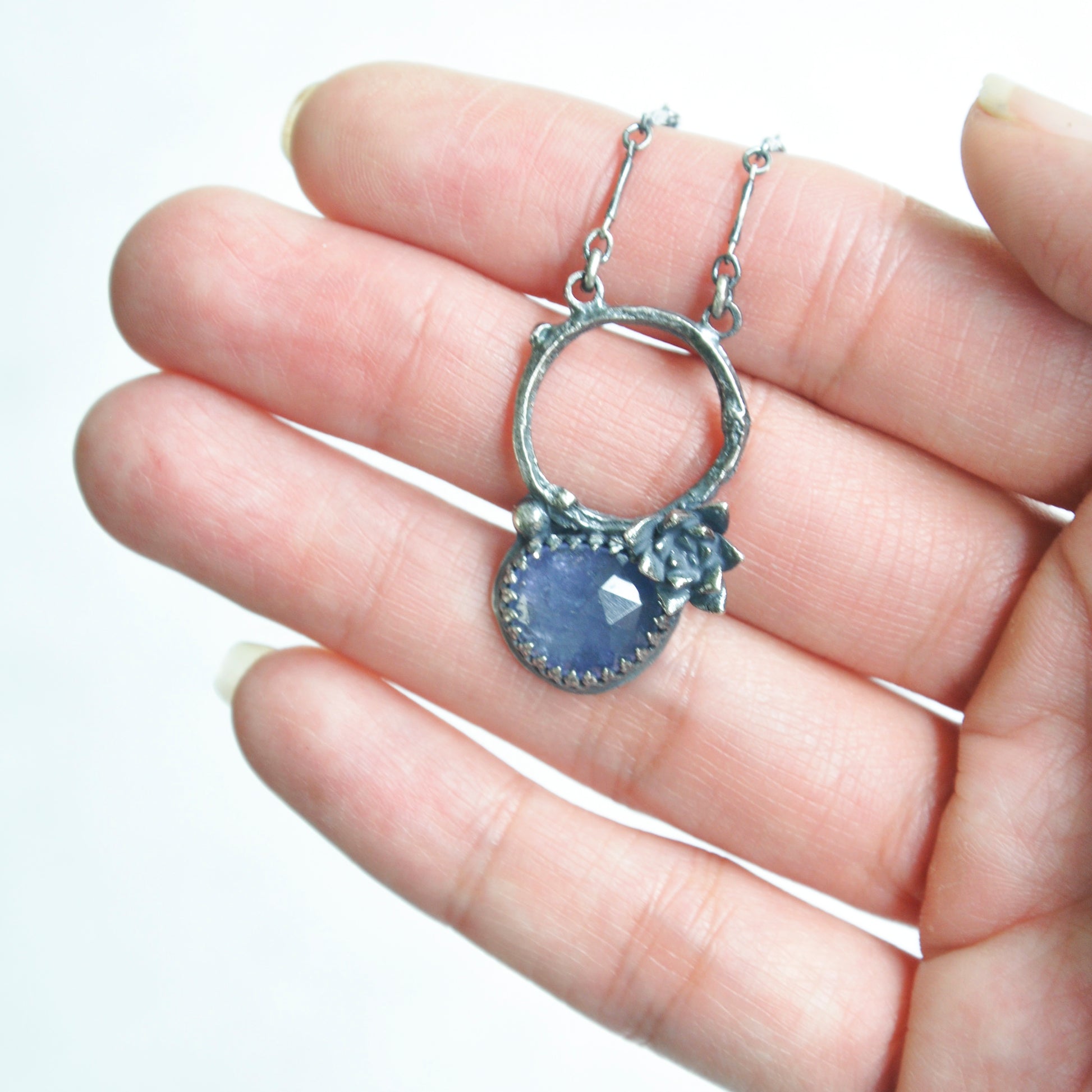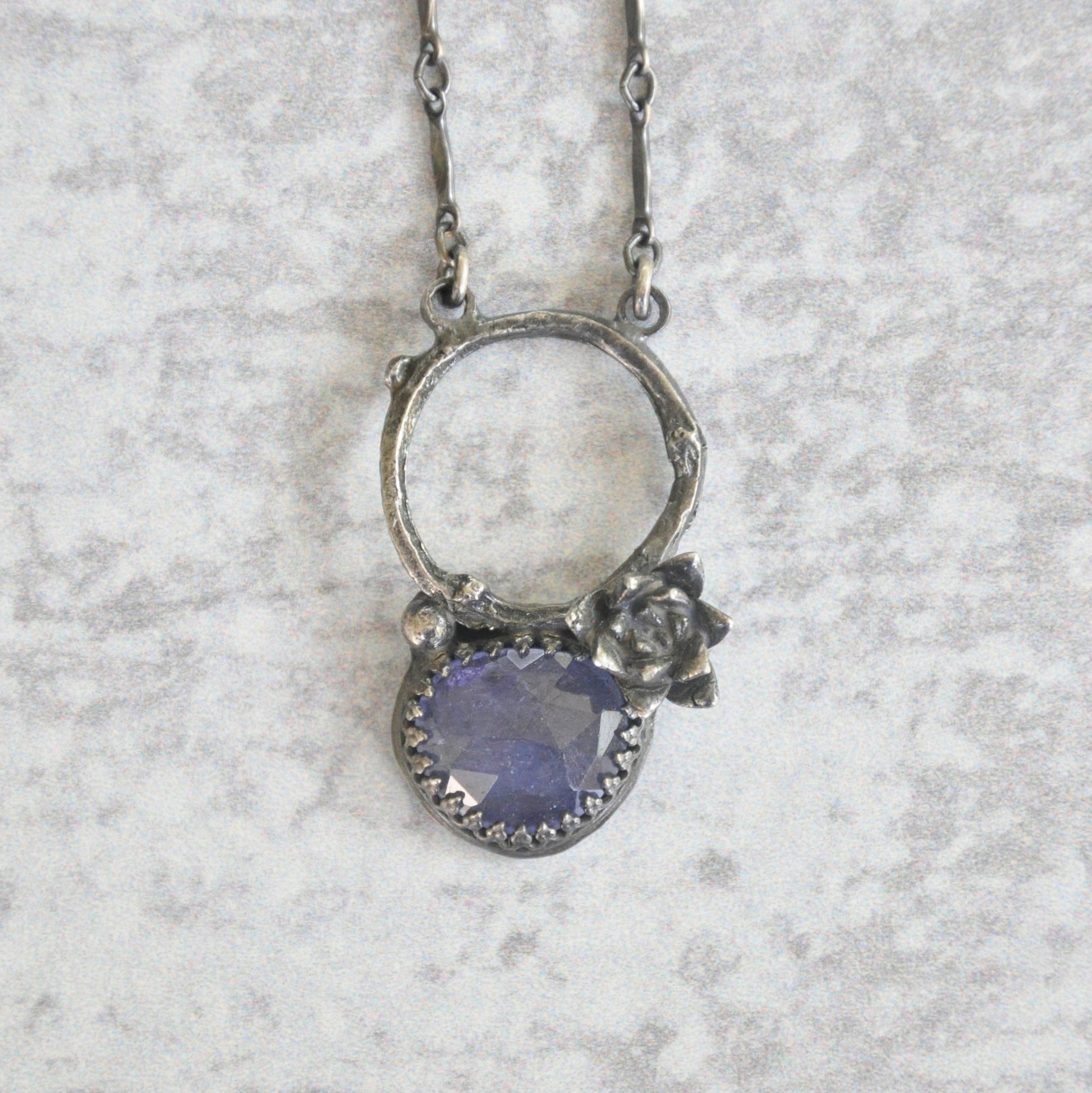 Highly faceted Tanzanite cab with a tiny casted succulent and a genuine casted twig. Sterling silver is patinaed for a weathered + antiqued look. Set in an hand forged bezel.