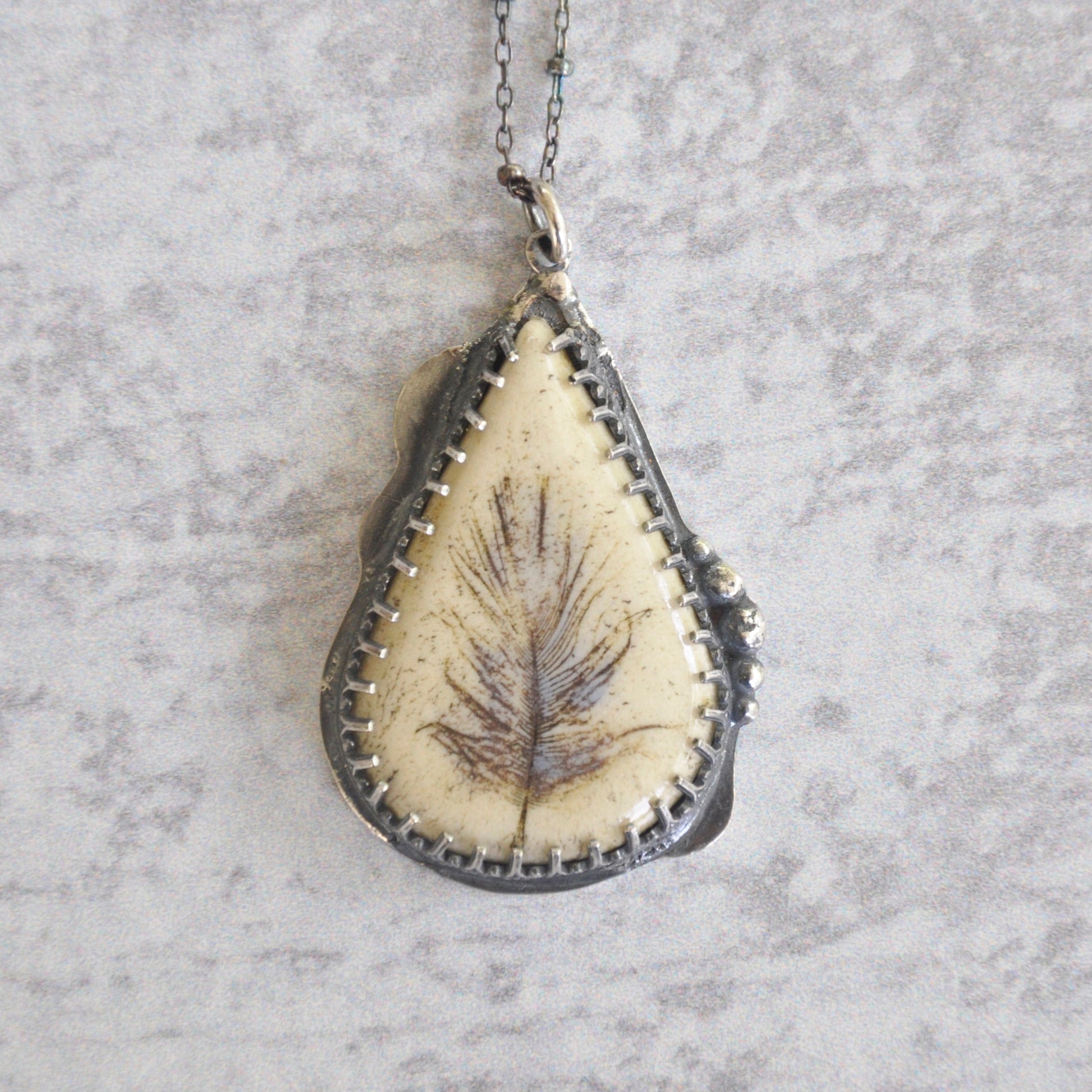 A real feather is imprinted in a ceramic cab and set with a deco bezel. Sterling silver is patinaed for a weathered + antiqued look.