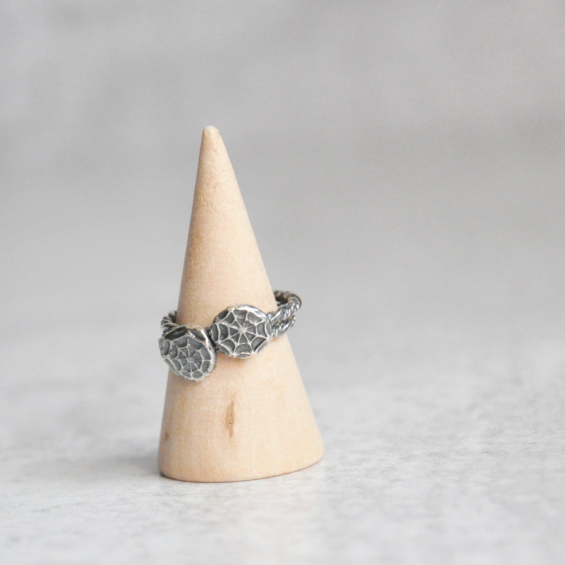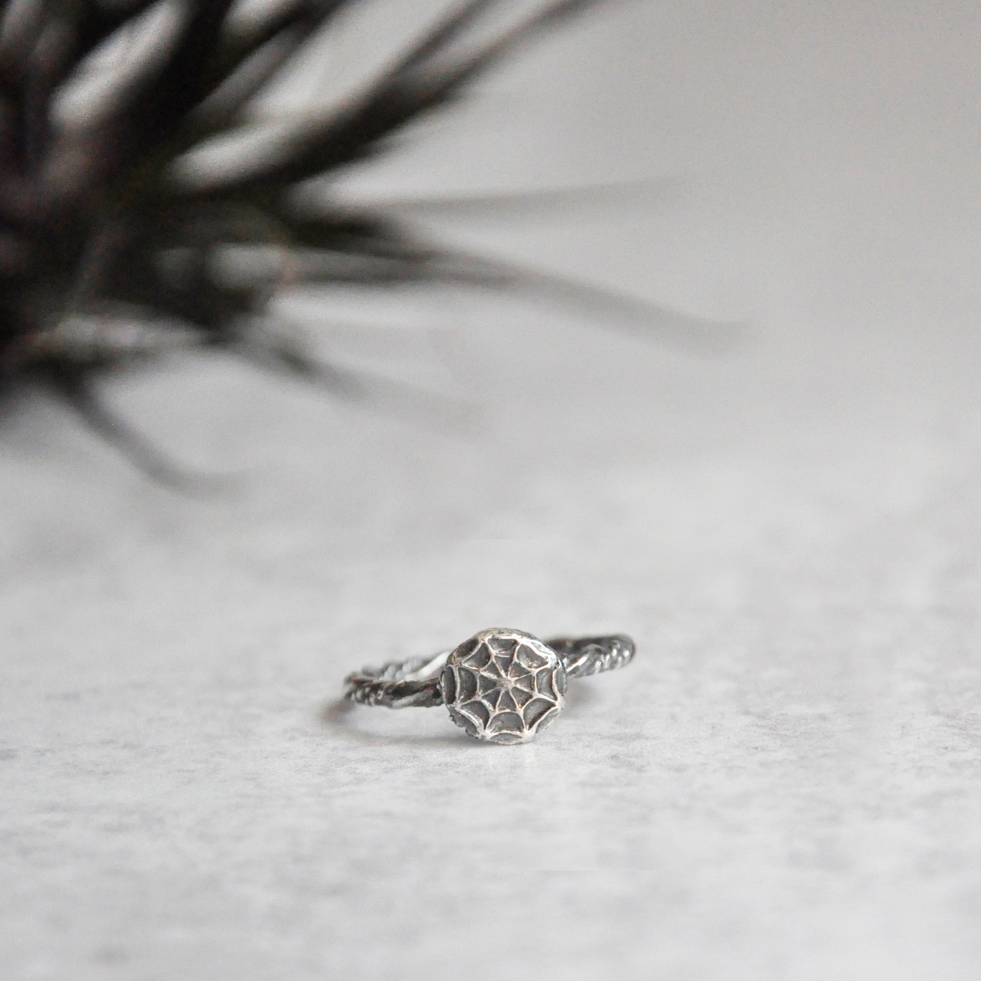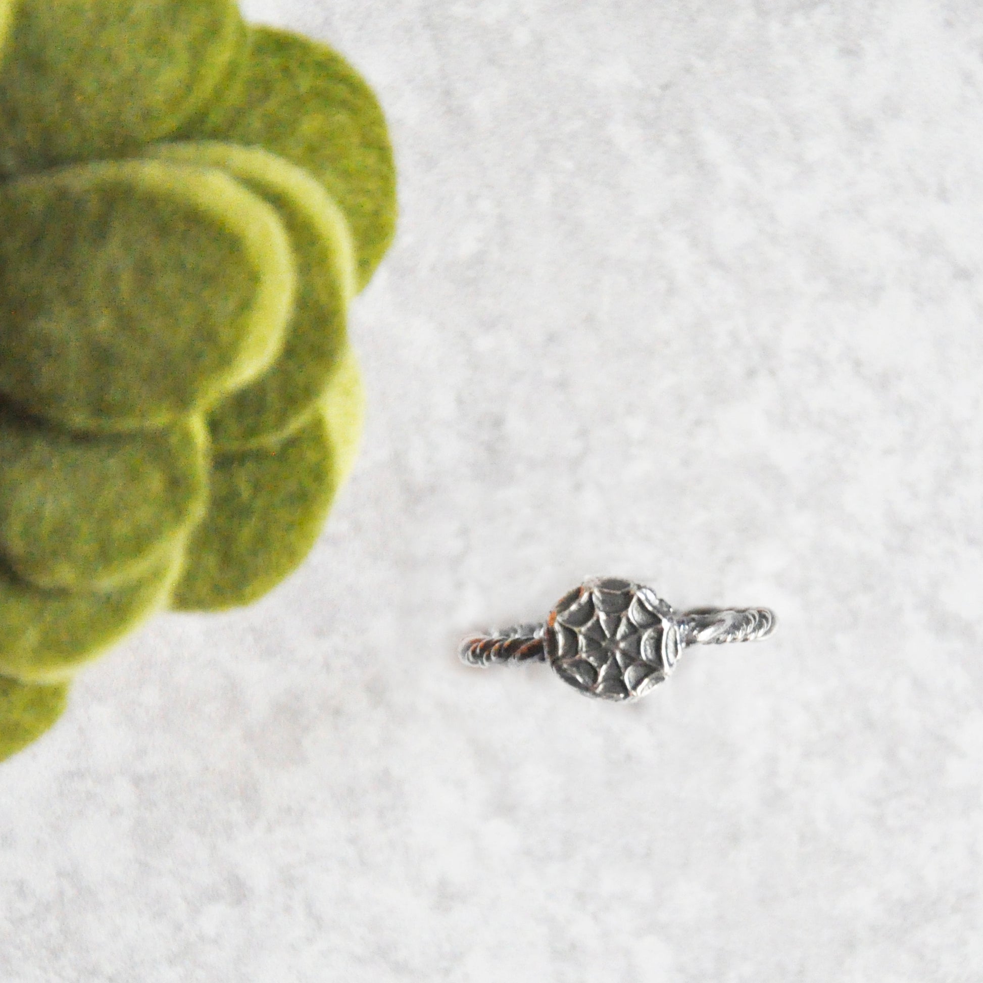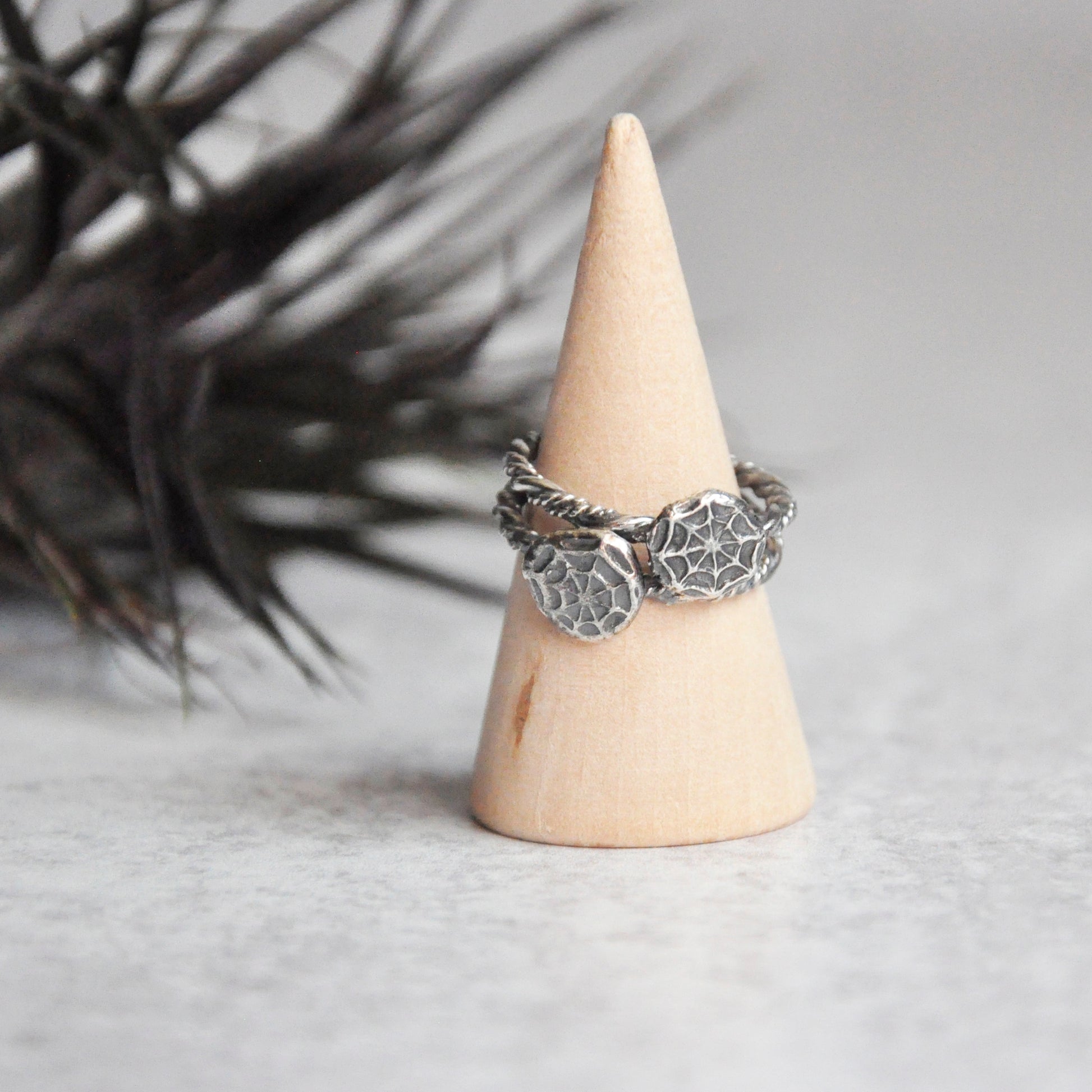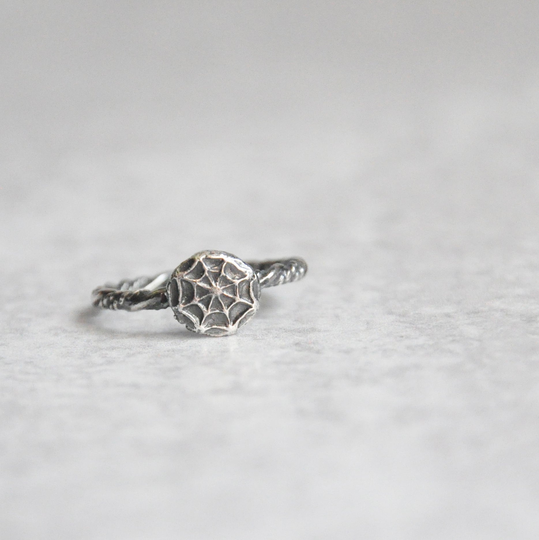A not so spooky spider web pebble is hand forged in fine silver with a tri-twisted band. Because of the unique way that the pebble is made, no two spider webs will be exactly alike.