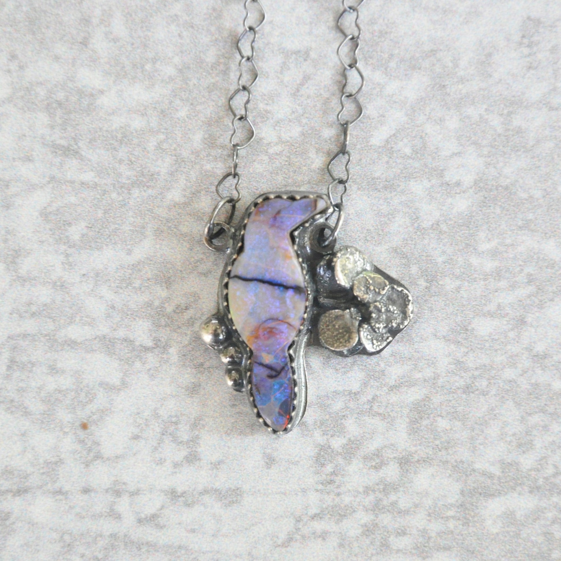 Monarch Opal (which is a synthetic material) is set hand forged deco bezel and a tiny succulent bloom (that used to be a real plant). Sterling silver is patinaed for a weathered + antiqued look.