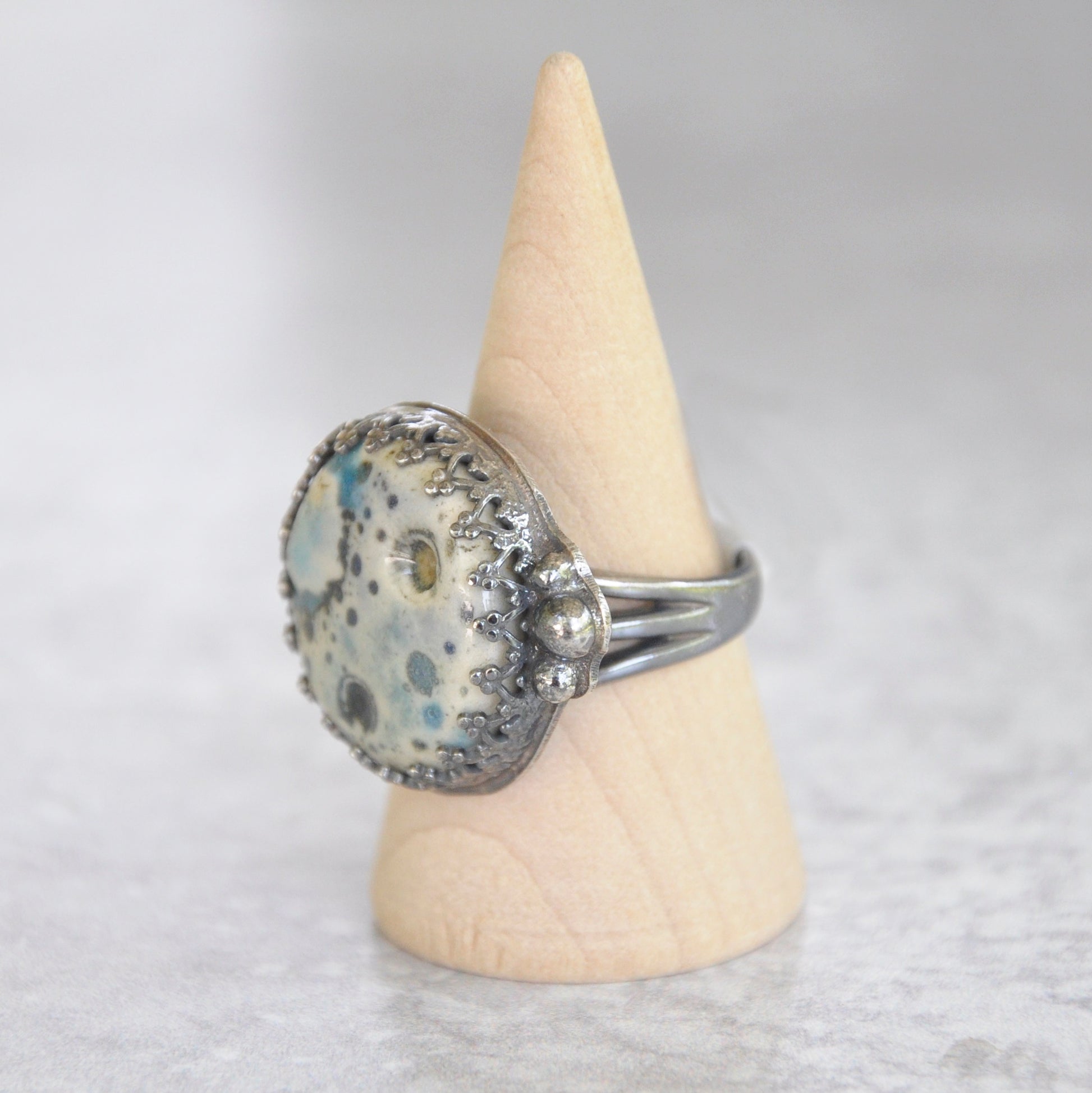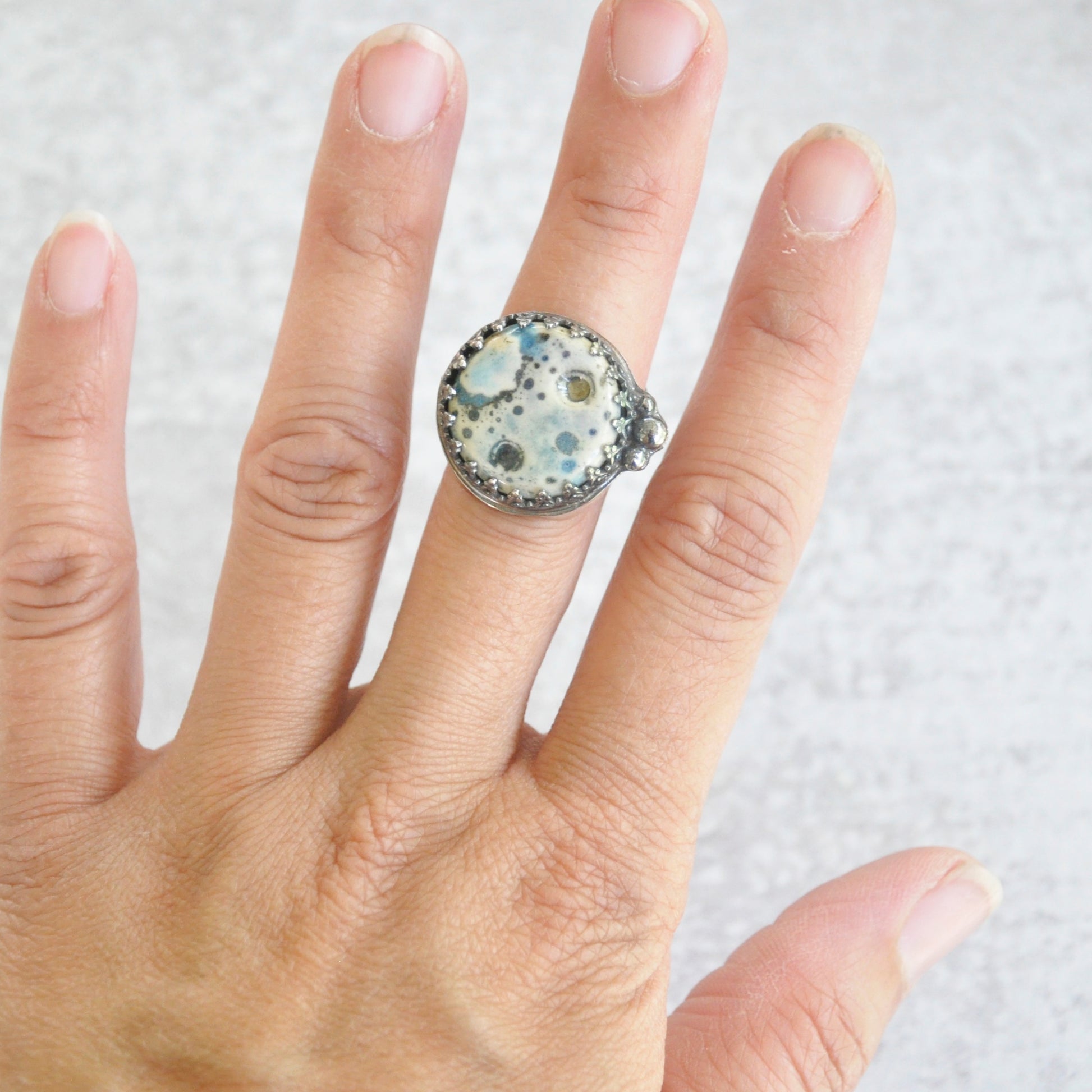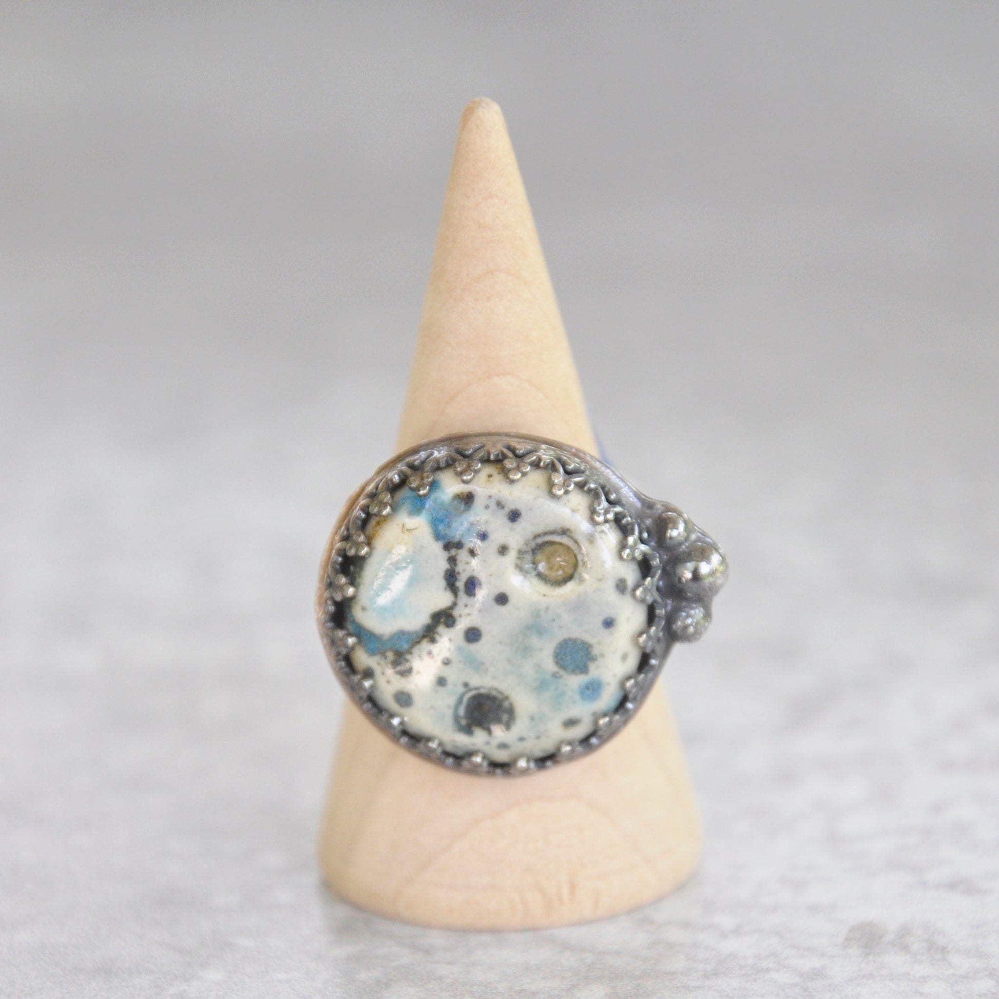 Textured ceramic moon in soft blues is set in sterling silver is patinaed for a weathered + antiqued look.