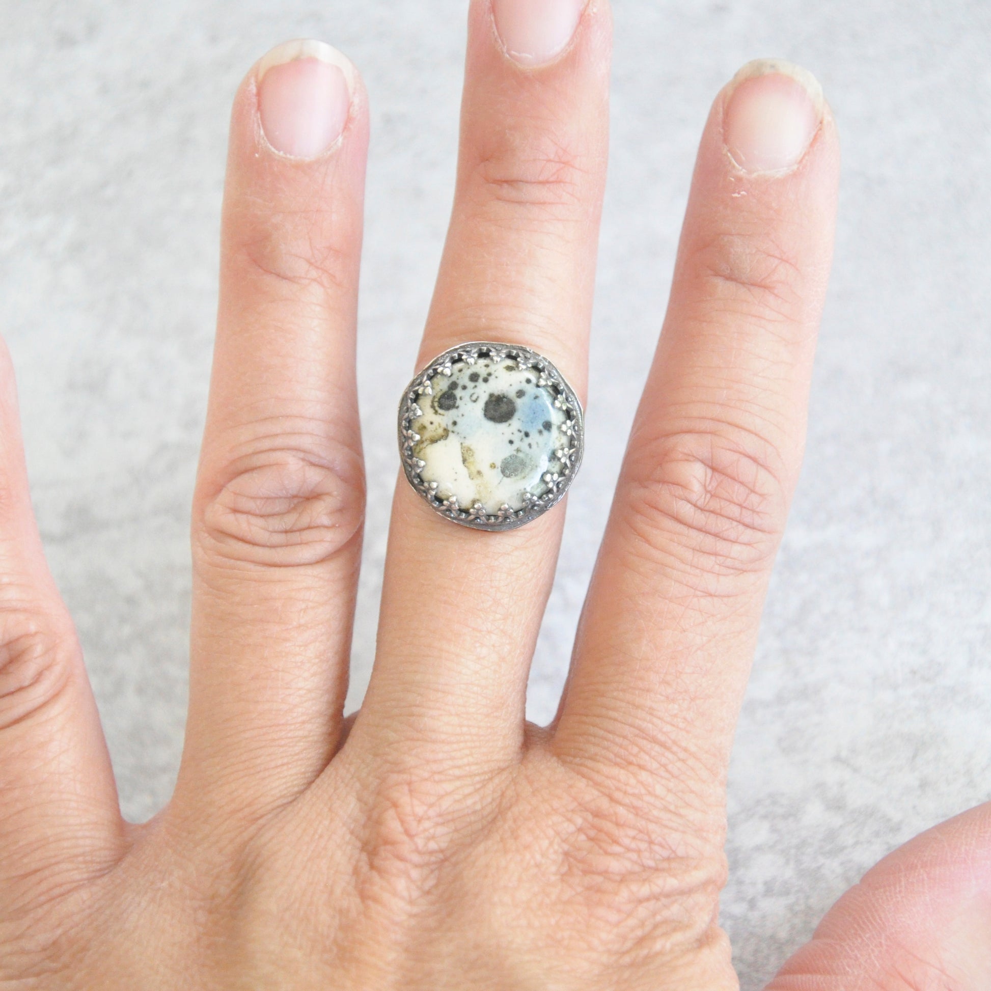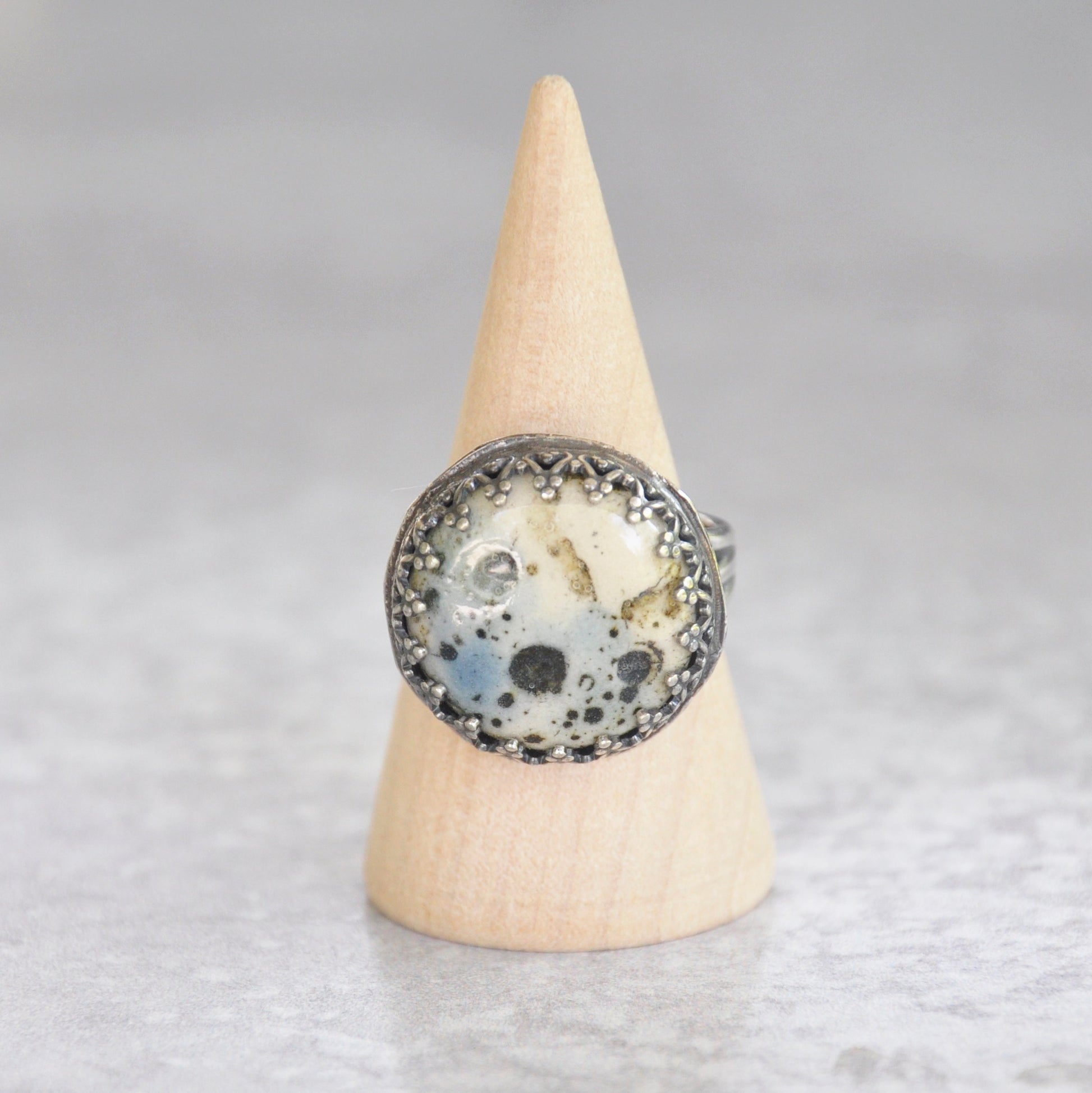 Textured ceramic moon in soft blues is set in sterling silver is patinaed for a weathered + antiqued look.