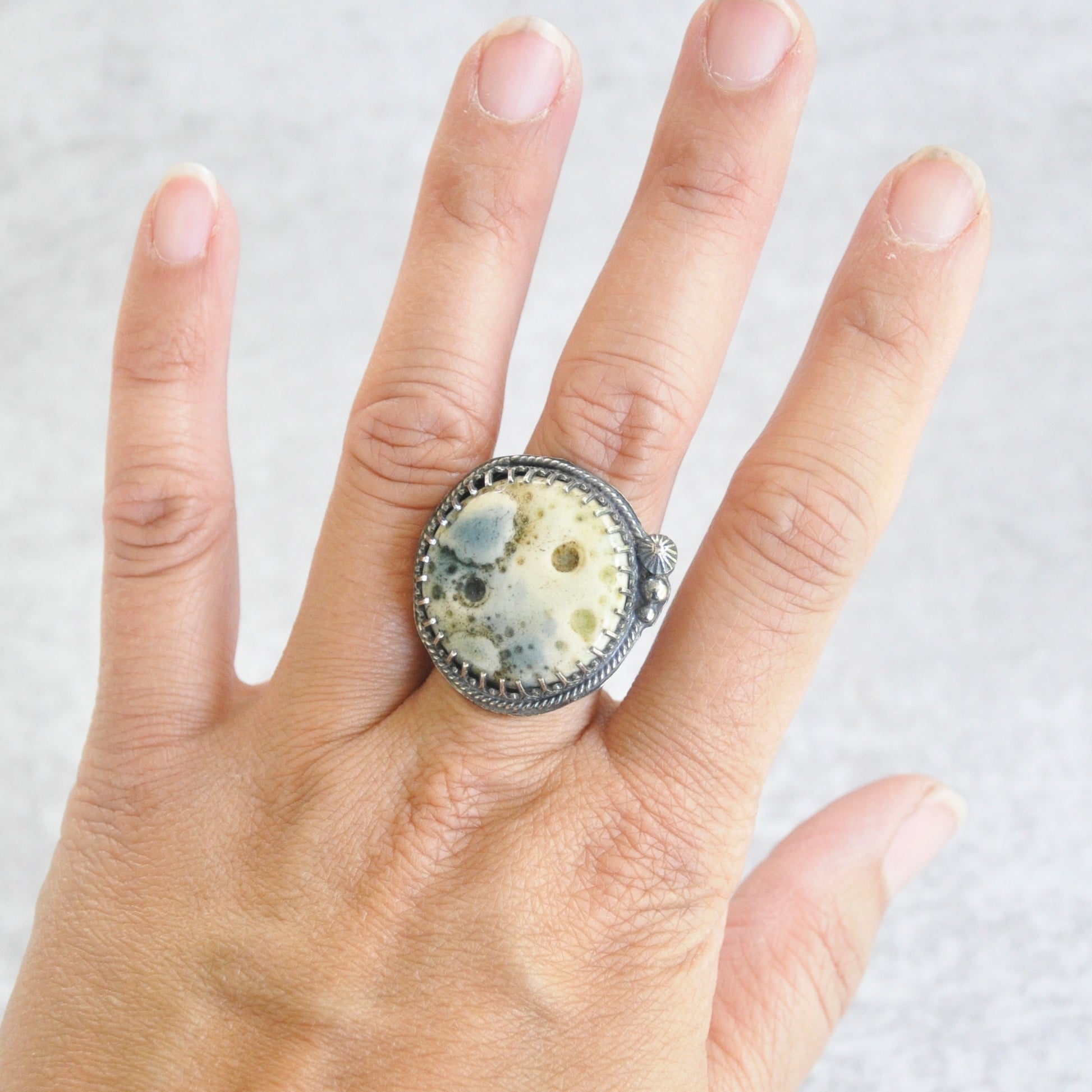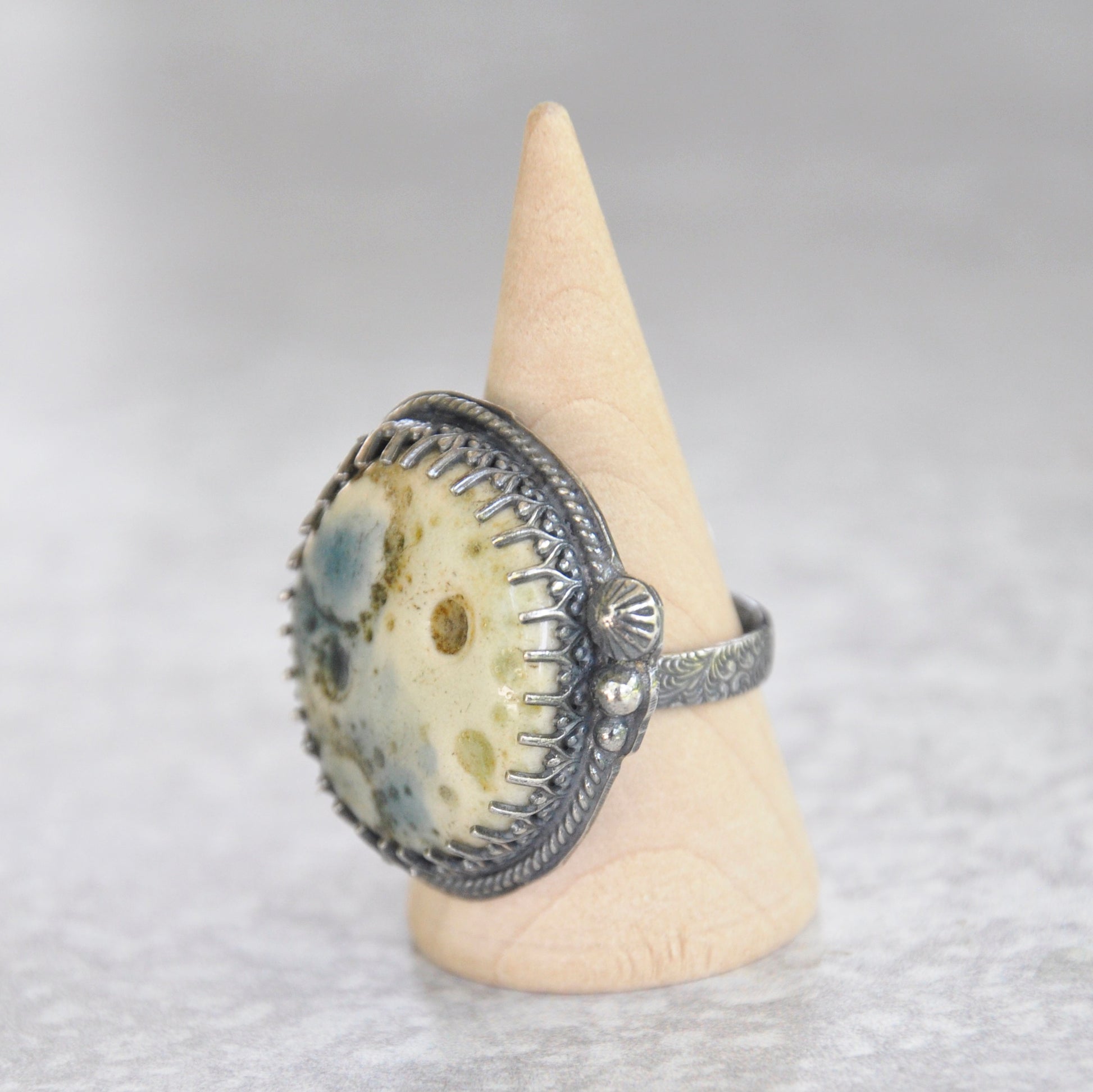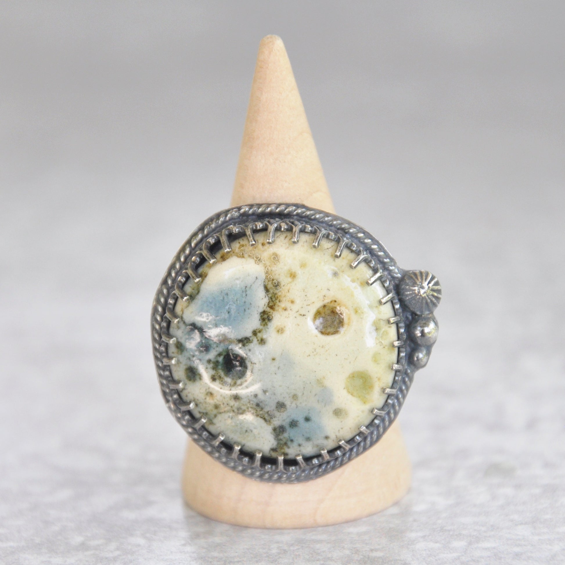 Textured ceramic moon in soft blues and greens is set in sterling silver is patinaed for a weathered + antiqued look.