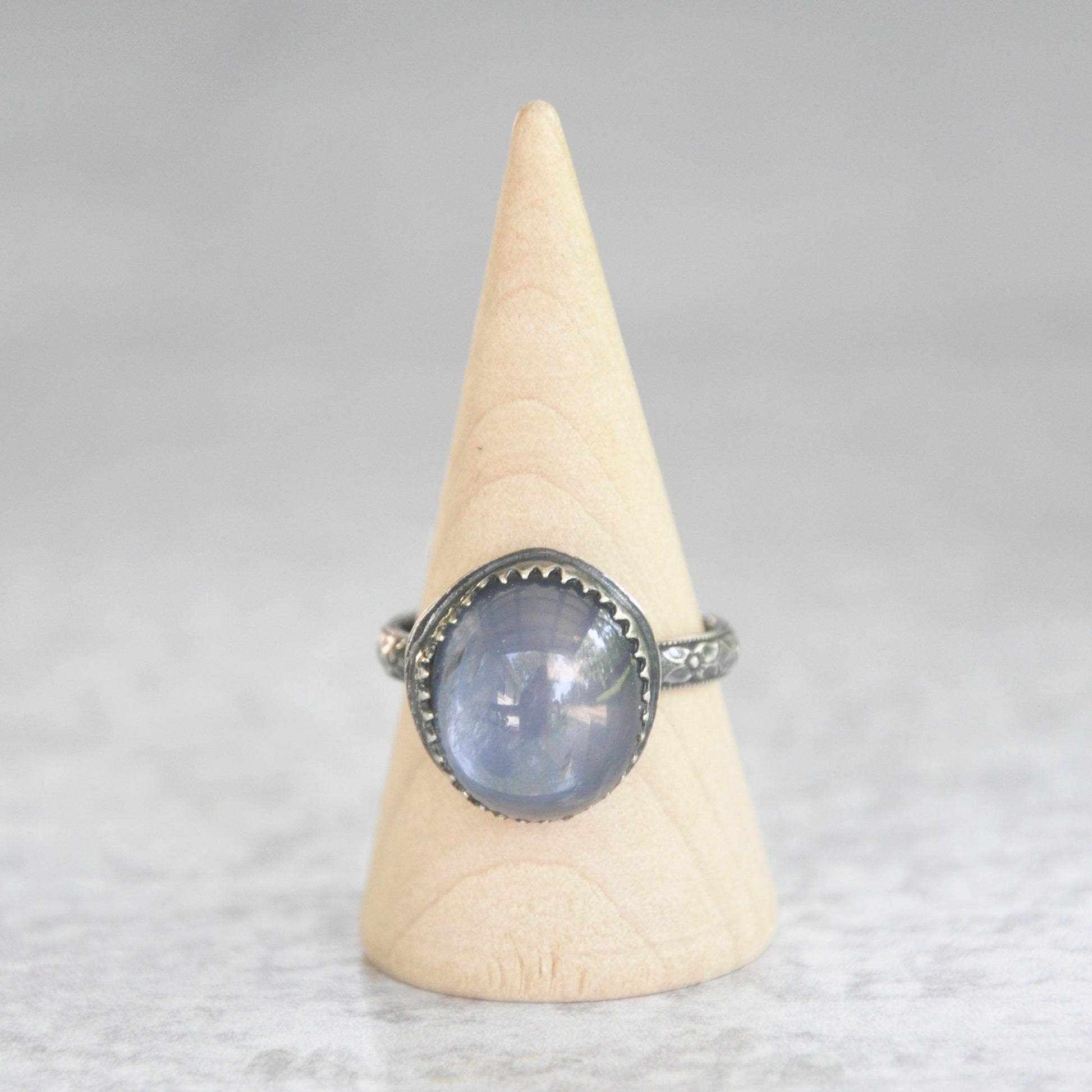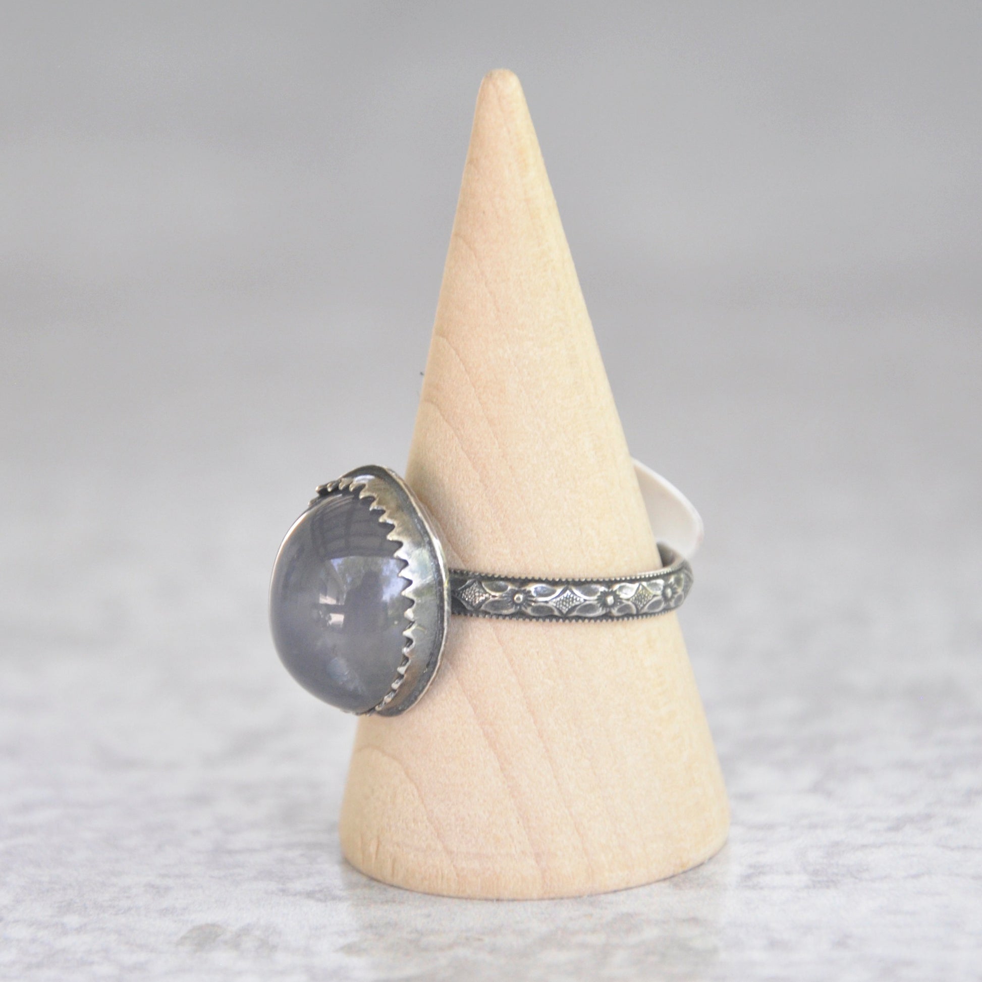 I was gifted with bag of stone cabochons from an older metalsmith who sadly passed away, so it's a mystery what this stone is. Set in sterling silver is patinaed for a weathered + antiqued look.