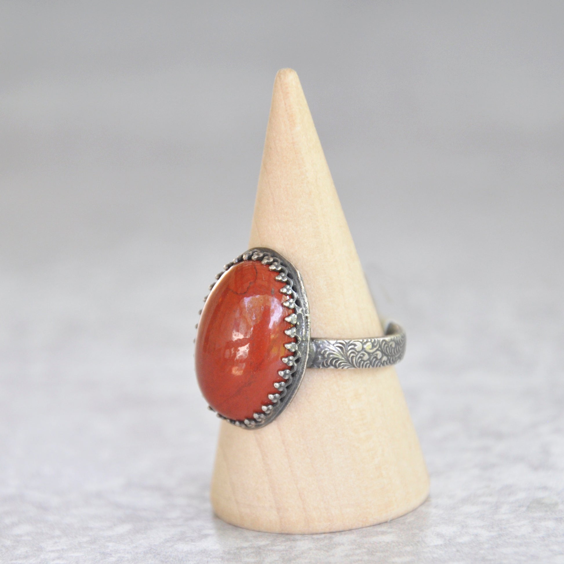 I was gifted with bag of stone cabochons from an older metalsmith who sadly passed away, so it's a mystery what this stone is. Set in sterling silver is patinaed for a weathered + antiqued look.