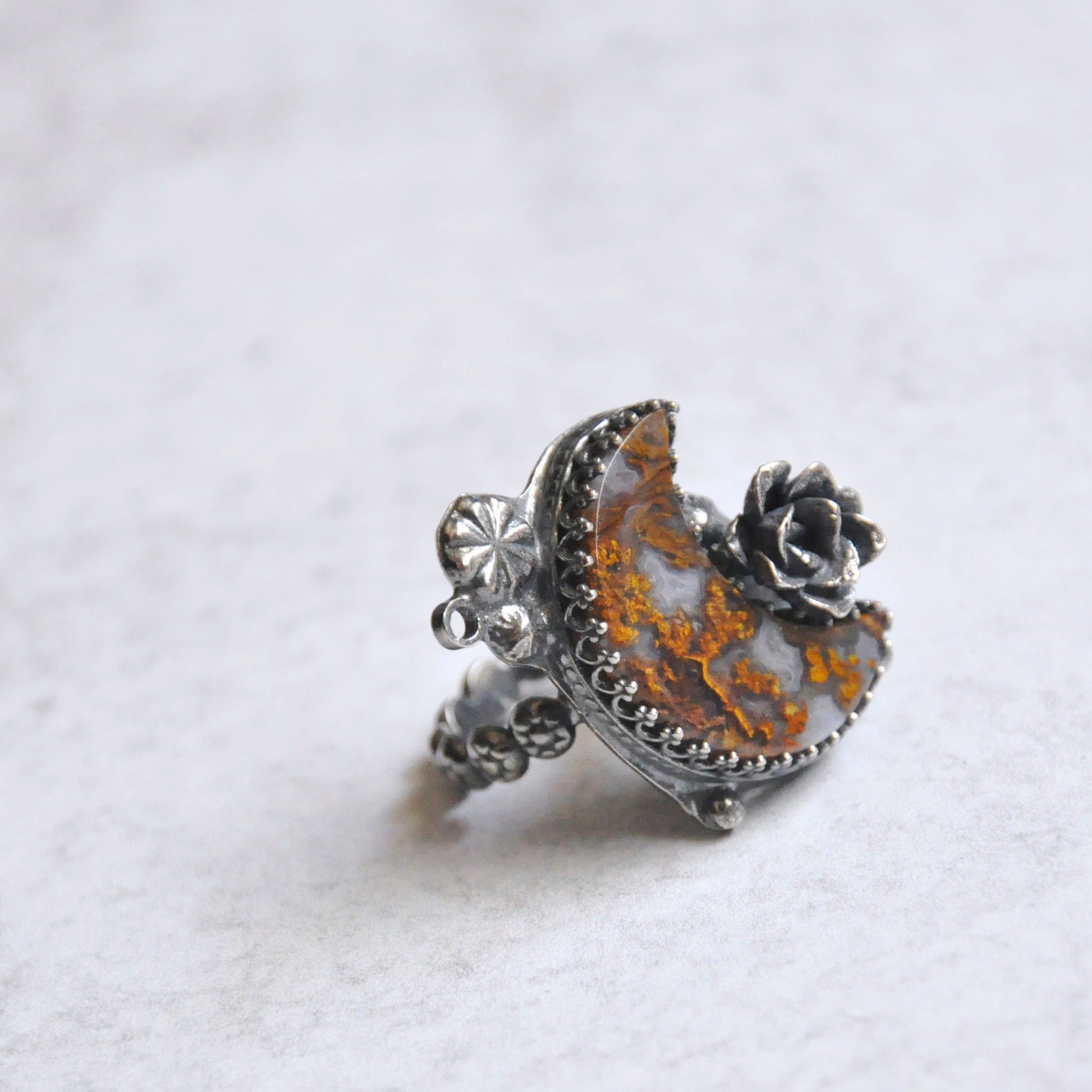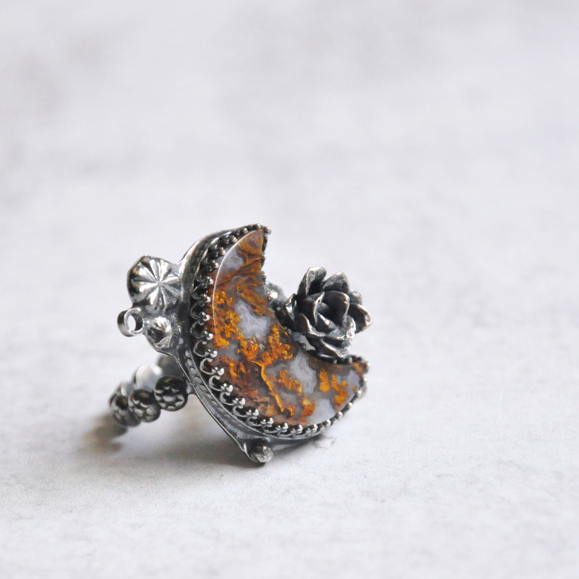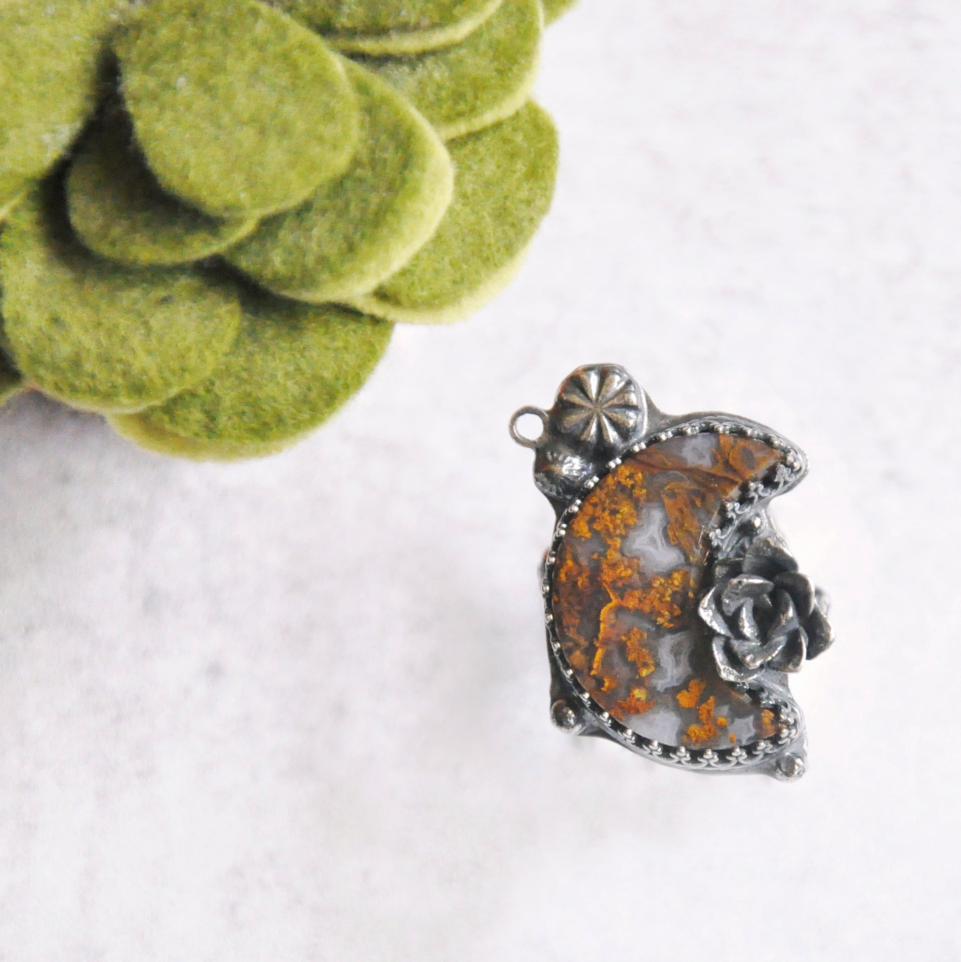 A yellow ochre crescent moon with tiny handforged elements. Sterling silver is patinaed for a weathered + antiqued look. Set in an hand forged bezel with statement succulent bloom casted in silver.
