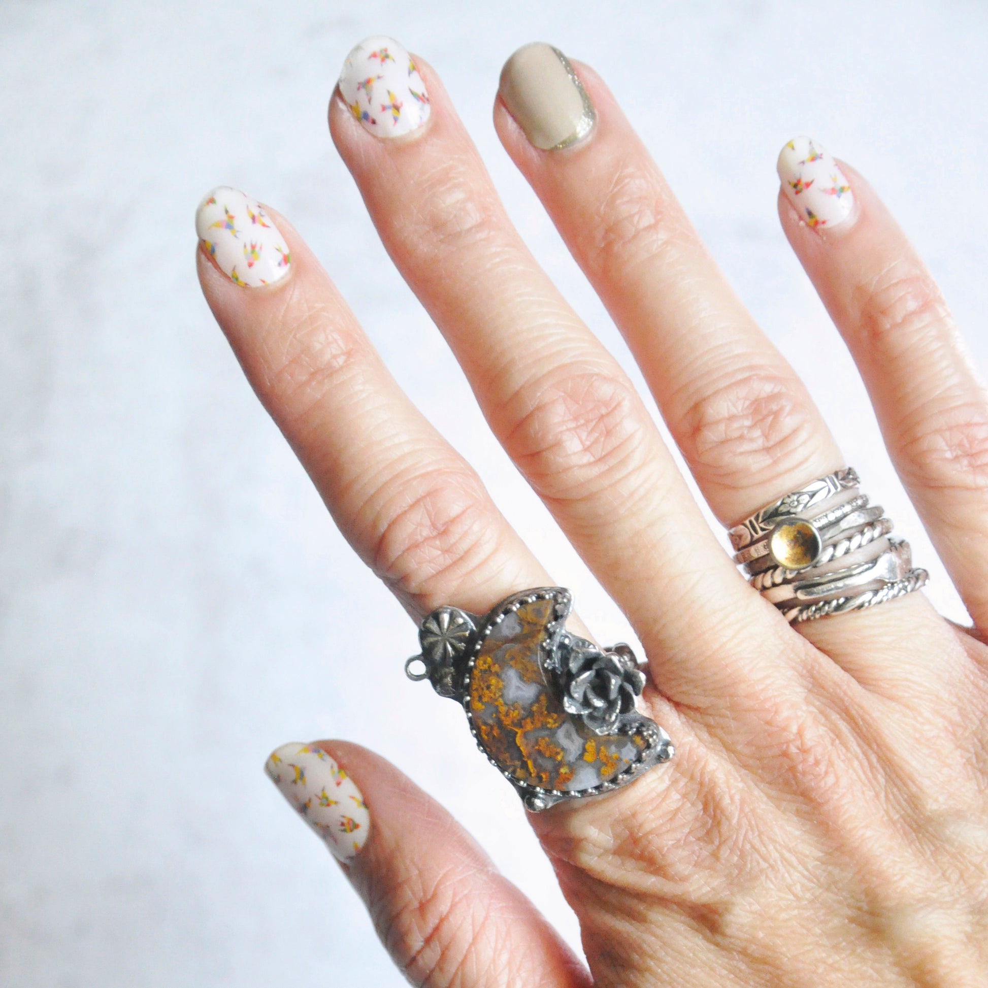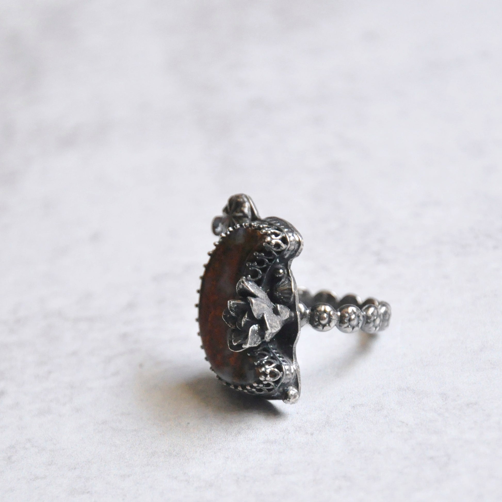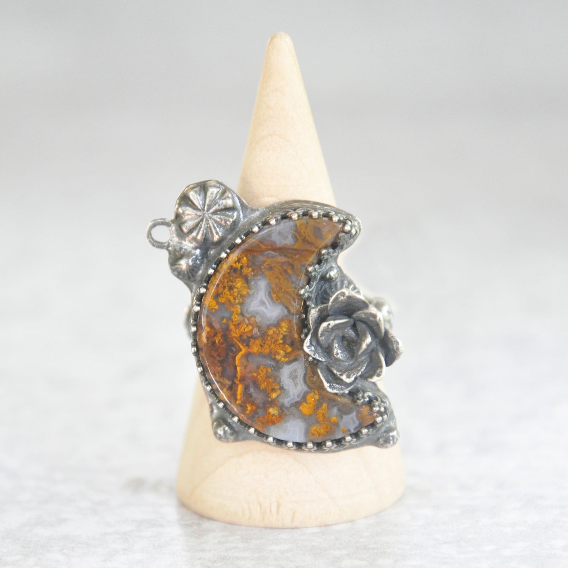 A yellow ochre crescent moon with tiny handforged elements. Sterling silver is patinaed for a weathered + antiqued look. Set in an hand forged bezel with statement succulent bloom casted in silver.