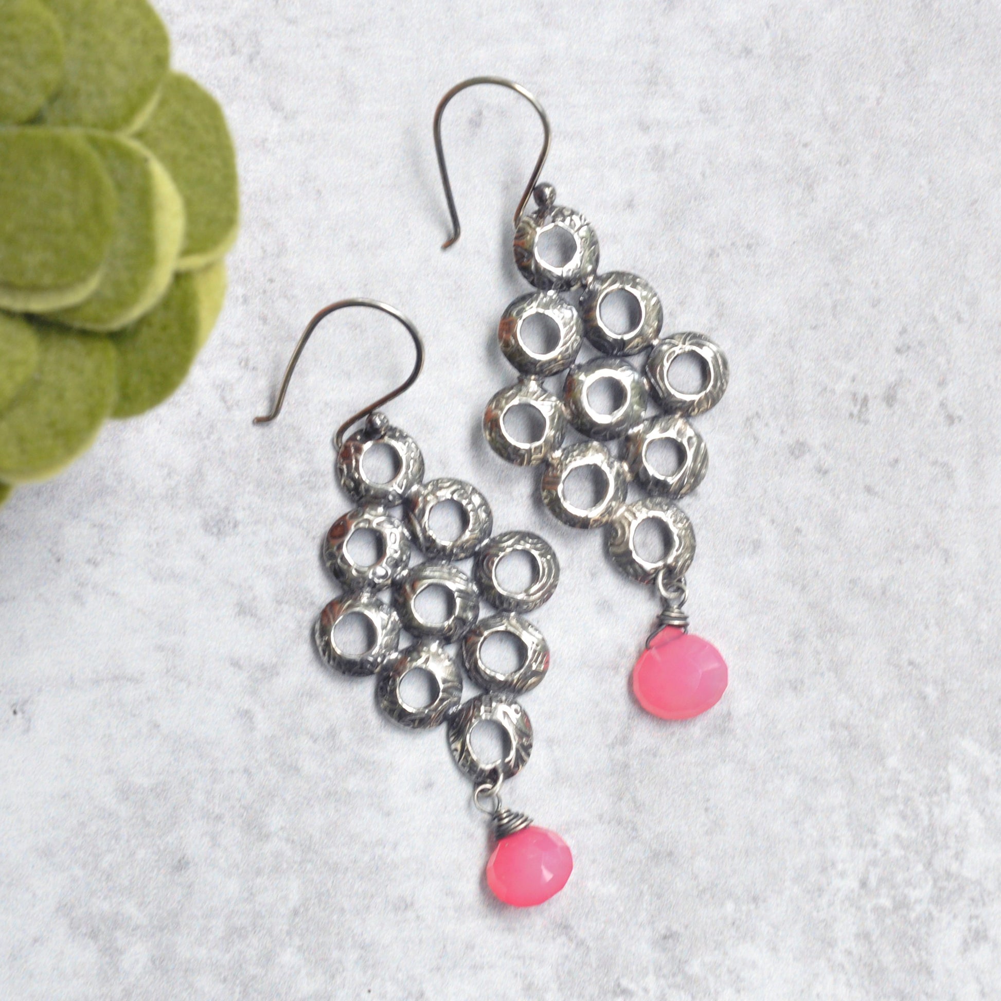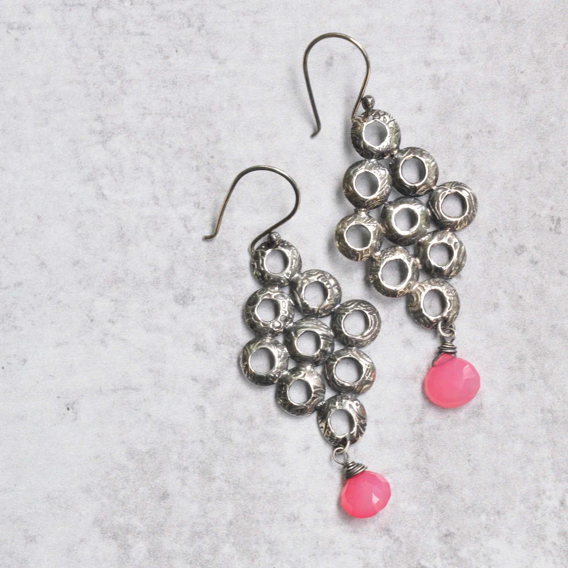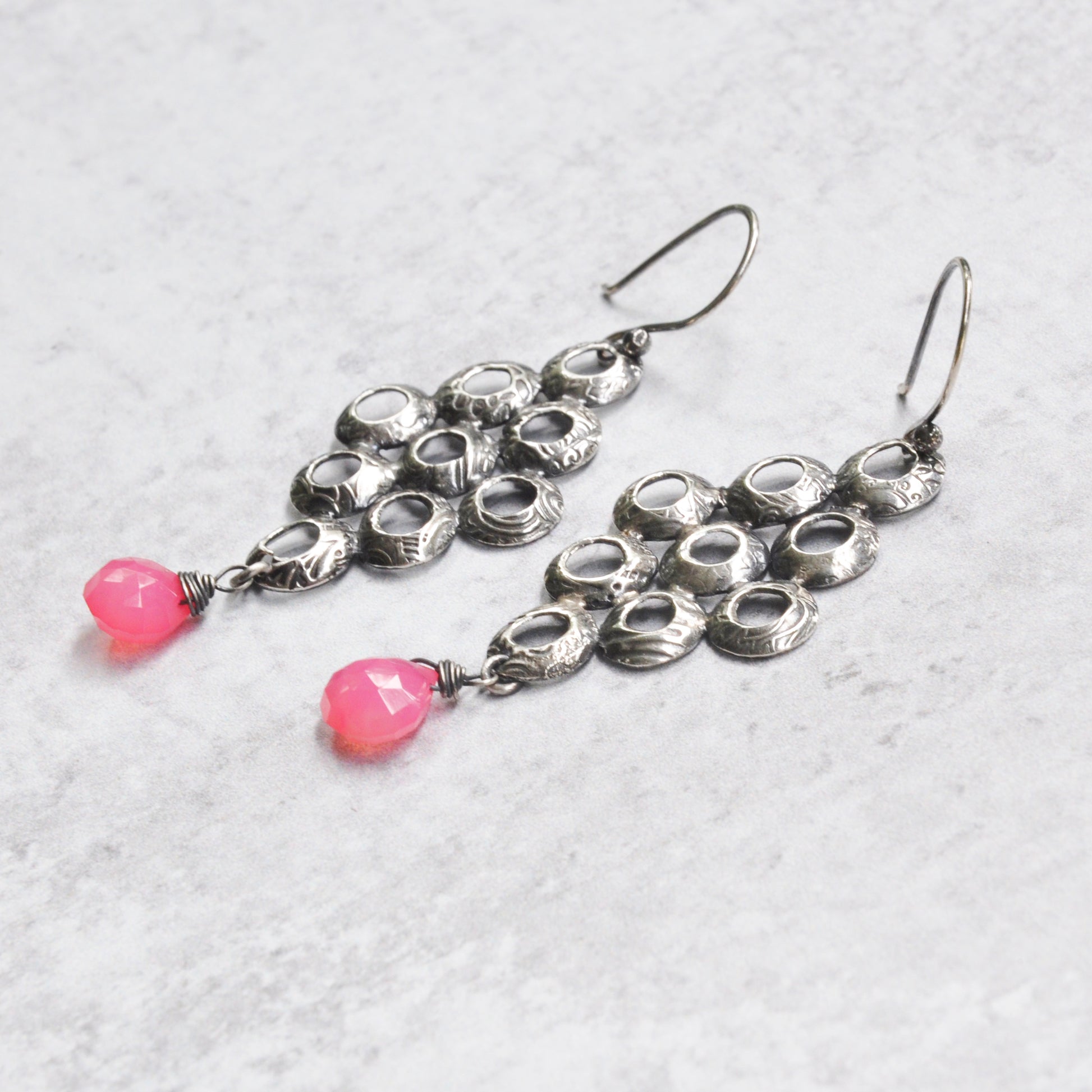 Unique detailed silver dangle earrings with a small pink chalcedony briolette at the end.