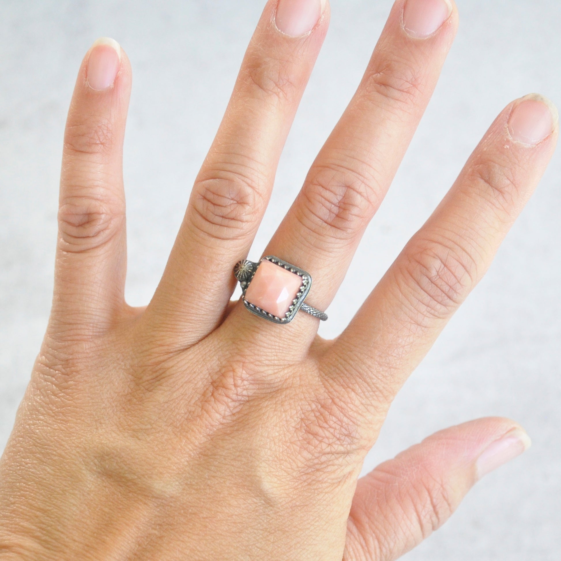 Faceted pink opal is set in sterling silver is patinaed for a weathered + antiqued look.