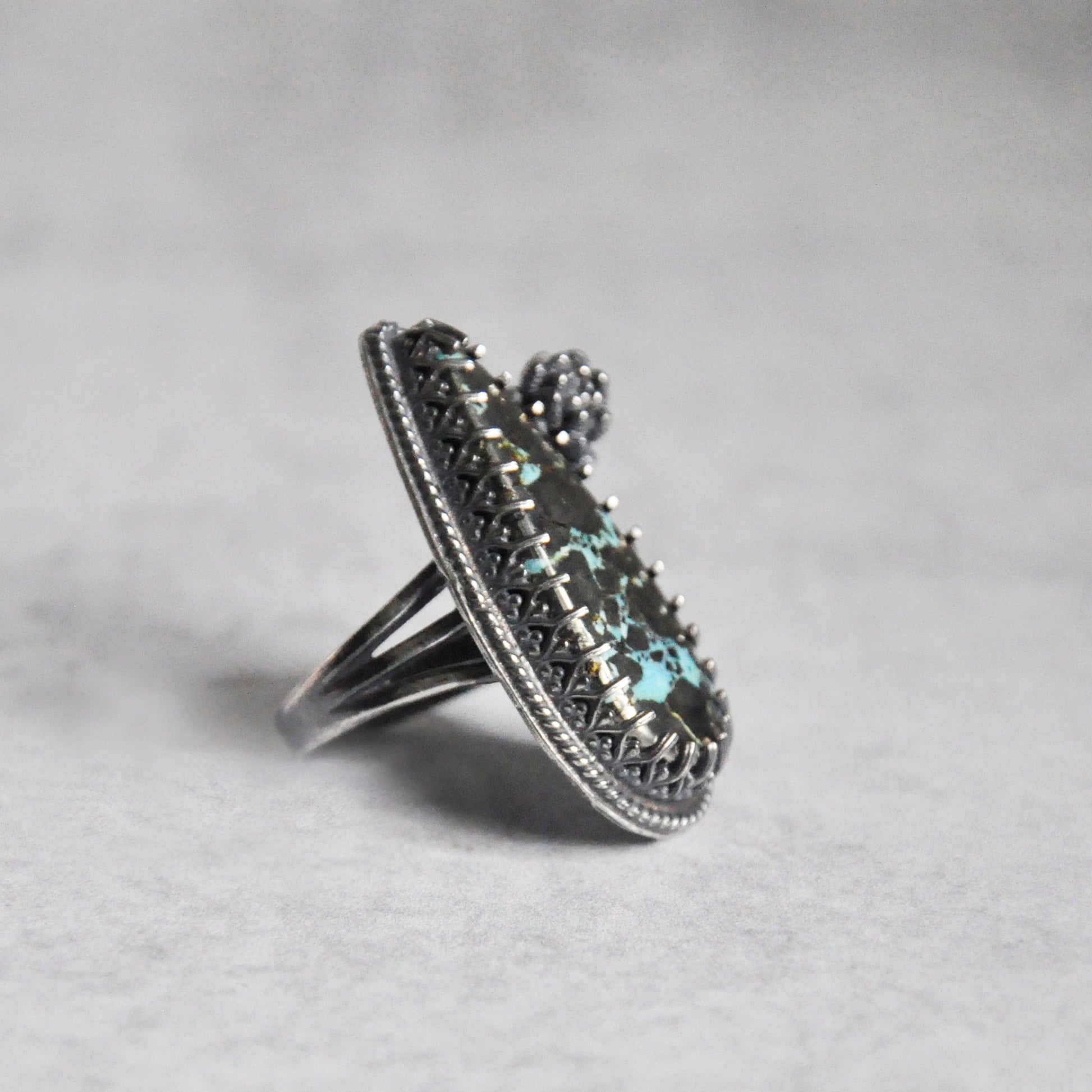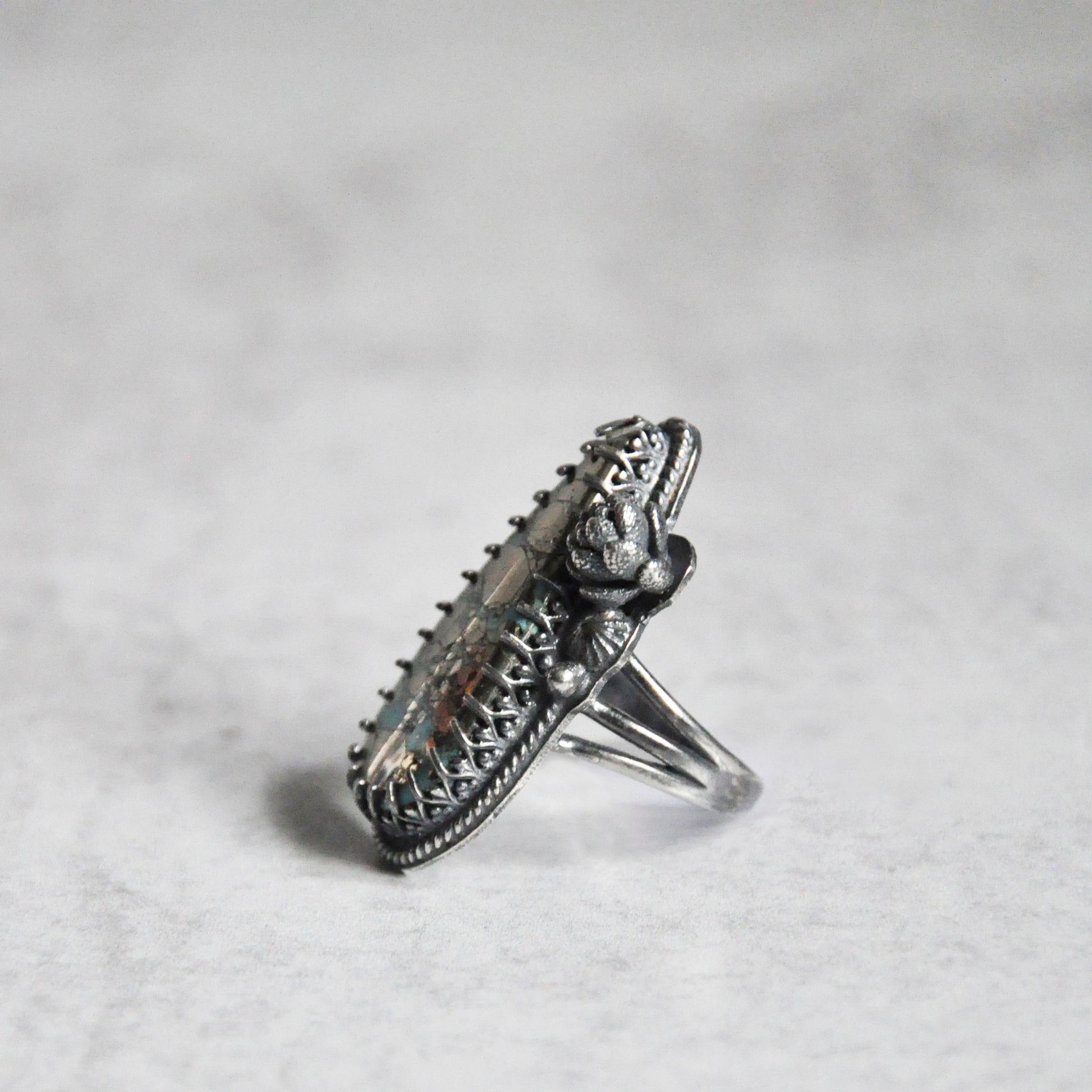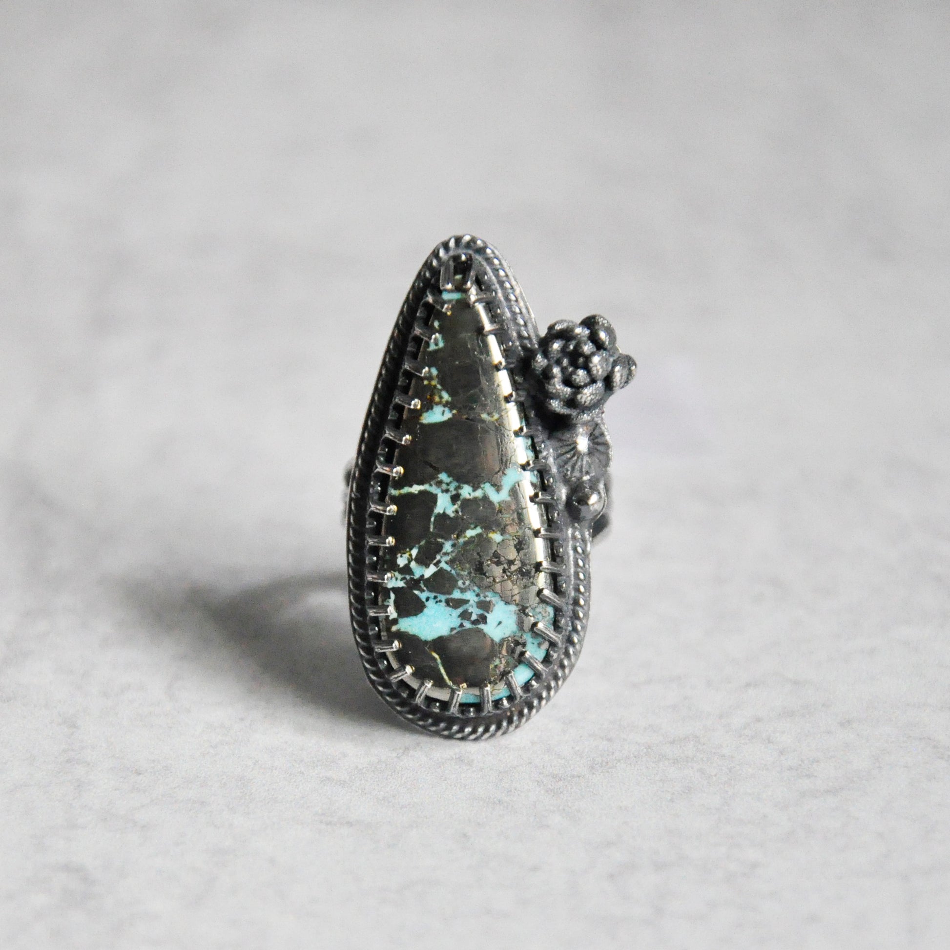 Kingman turquoise with a heavy inclusion of pyrite. Sterling silver is patinaed for a weathered + antiqued look. Set in an hand forged bezel and a filigree band.