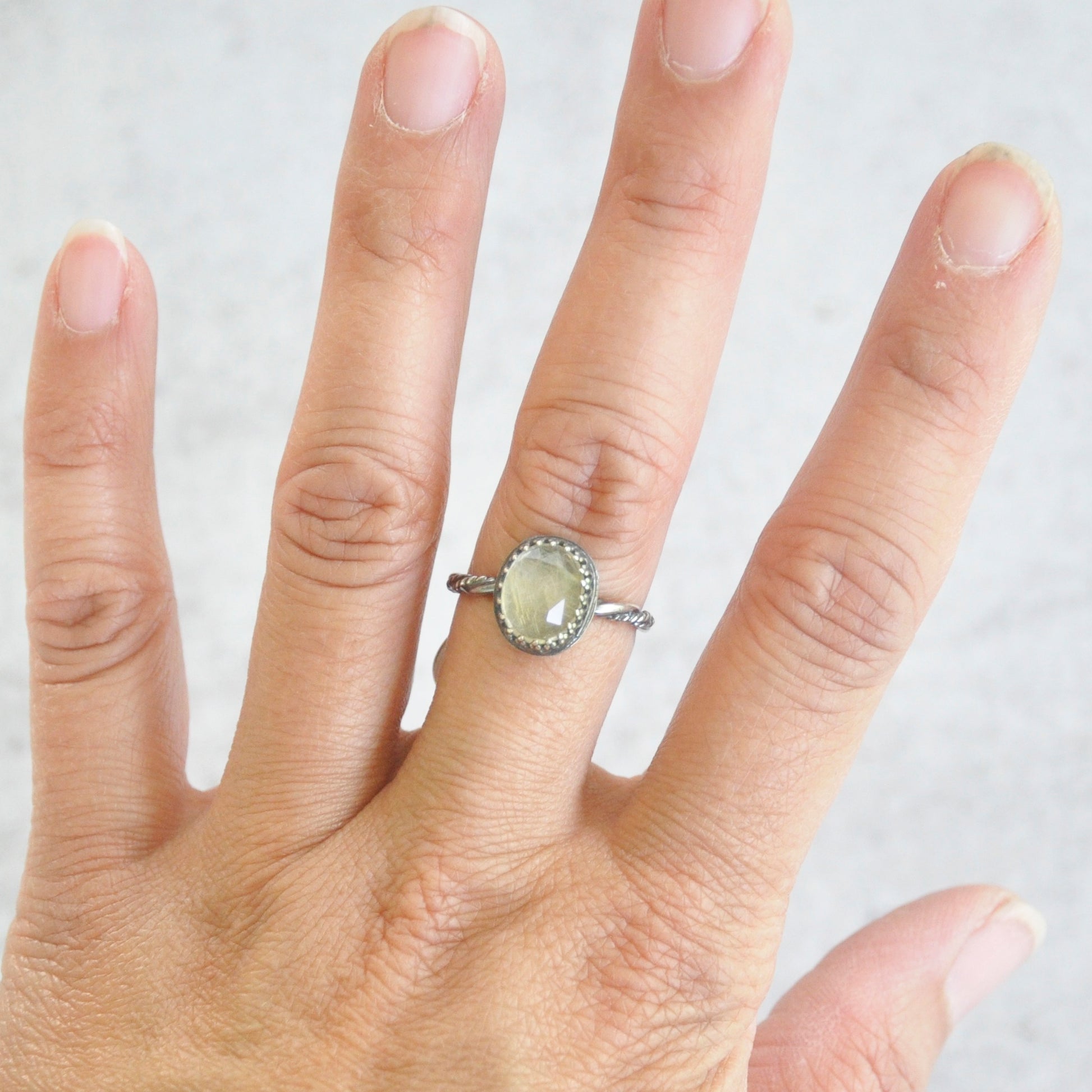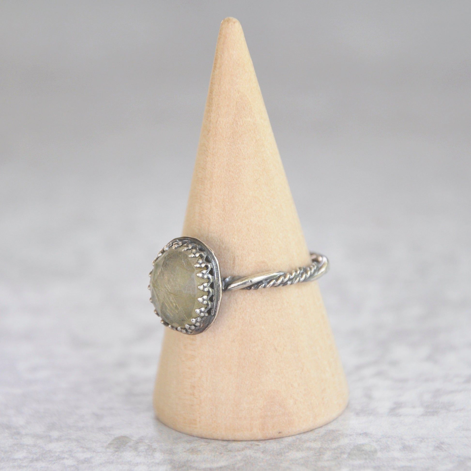 Faceted reticulated quartz is set in sterling silver is patinaed for a weathered + antiqued look.