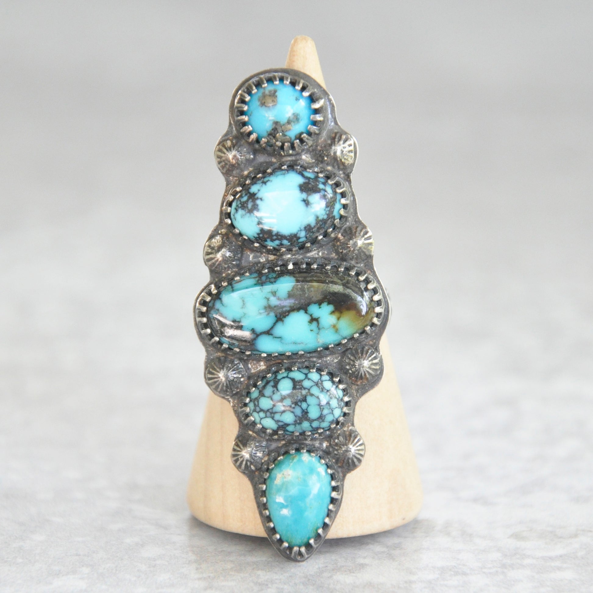 A statement ring of mixed turquoise. Sterling silver is patinaed for a weathered + antiqued look. Set in an hand forged bezel and a hand forged beaded band.