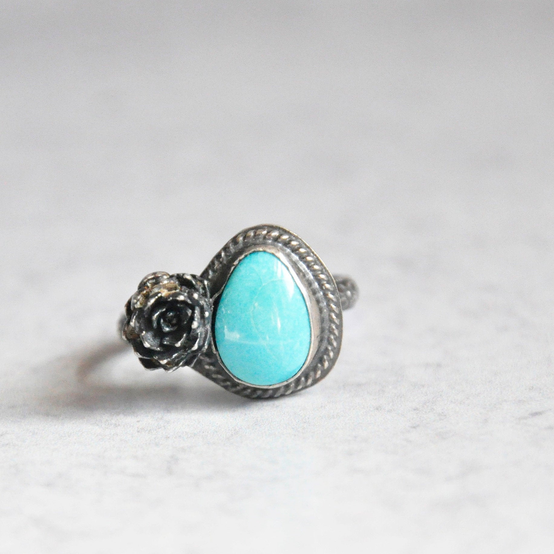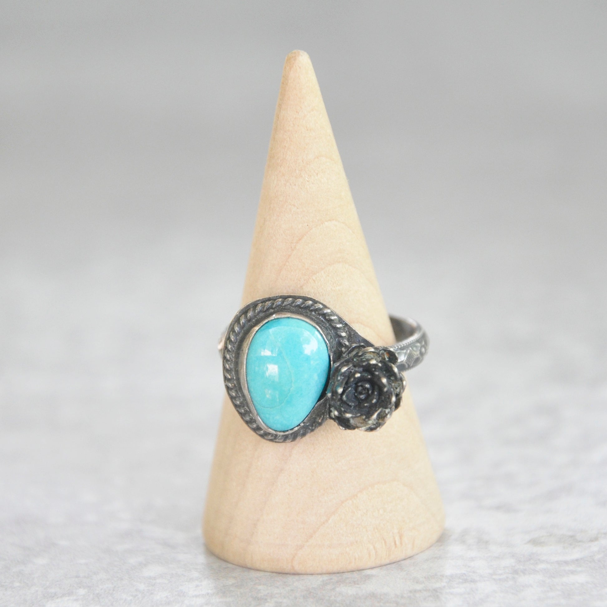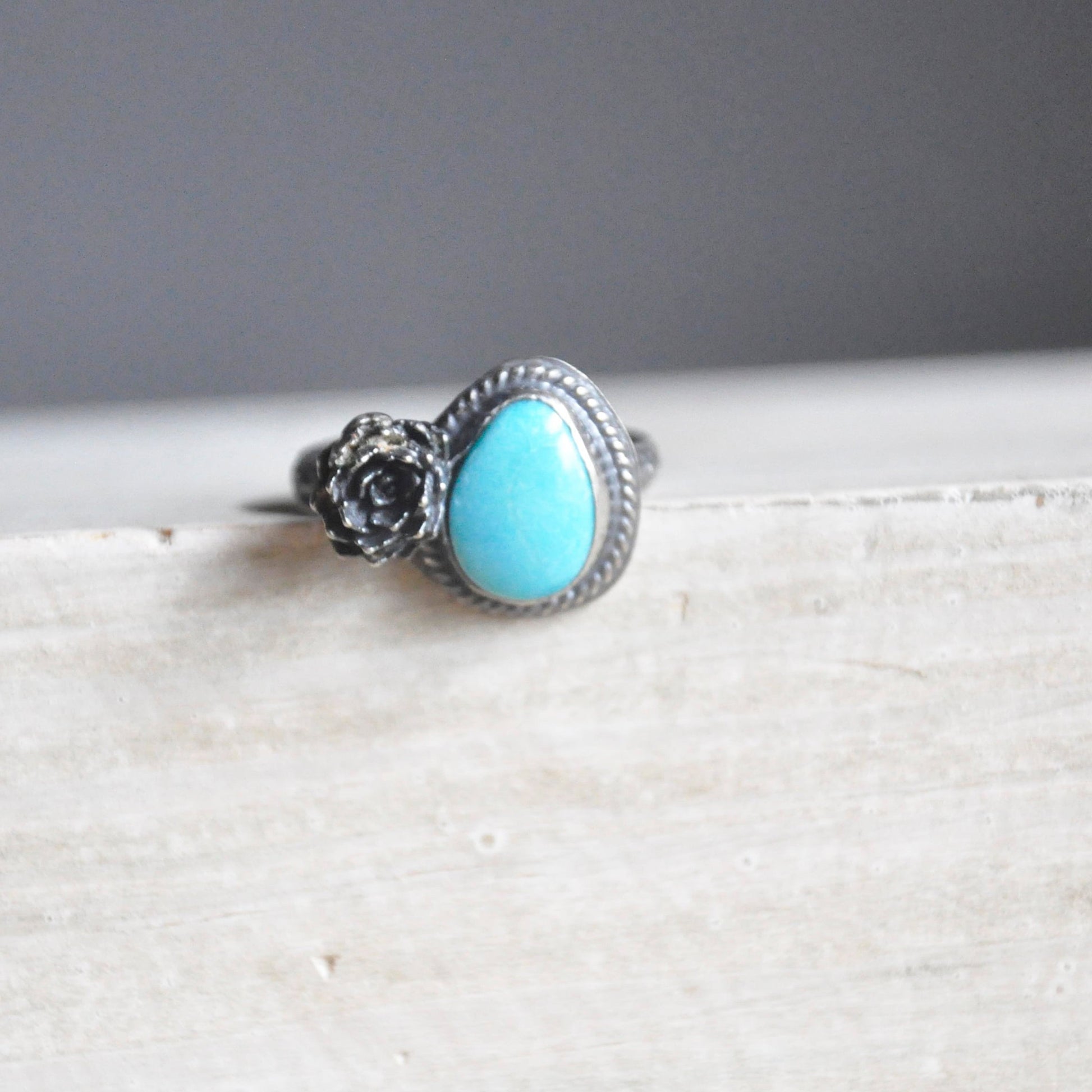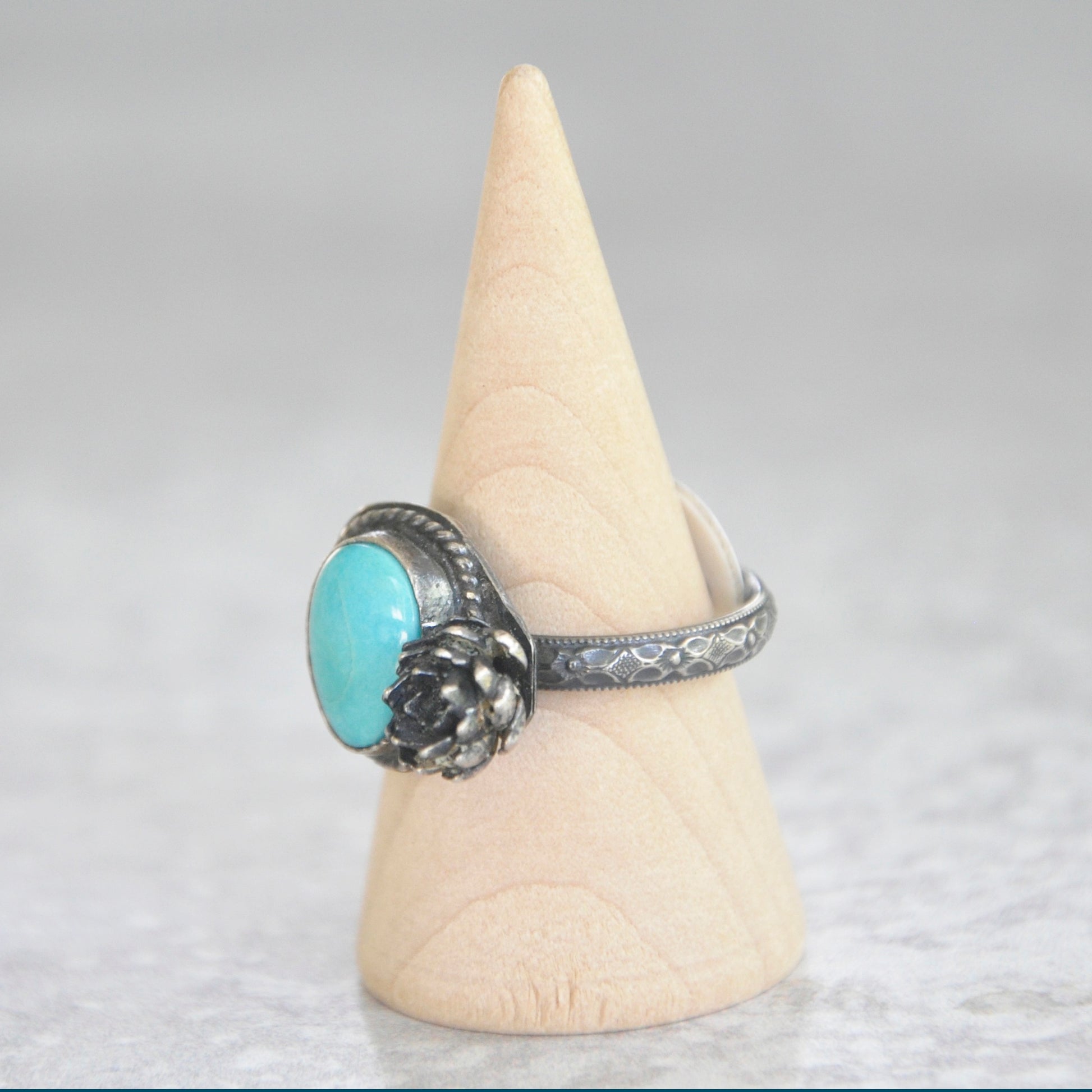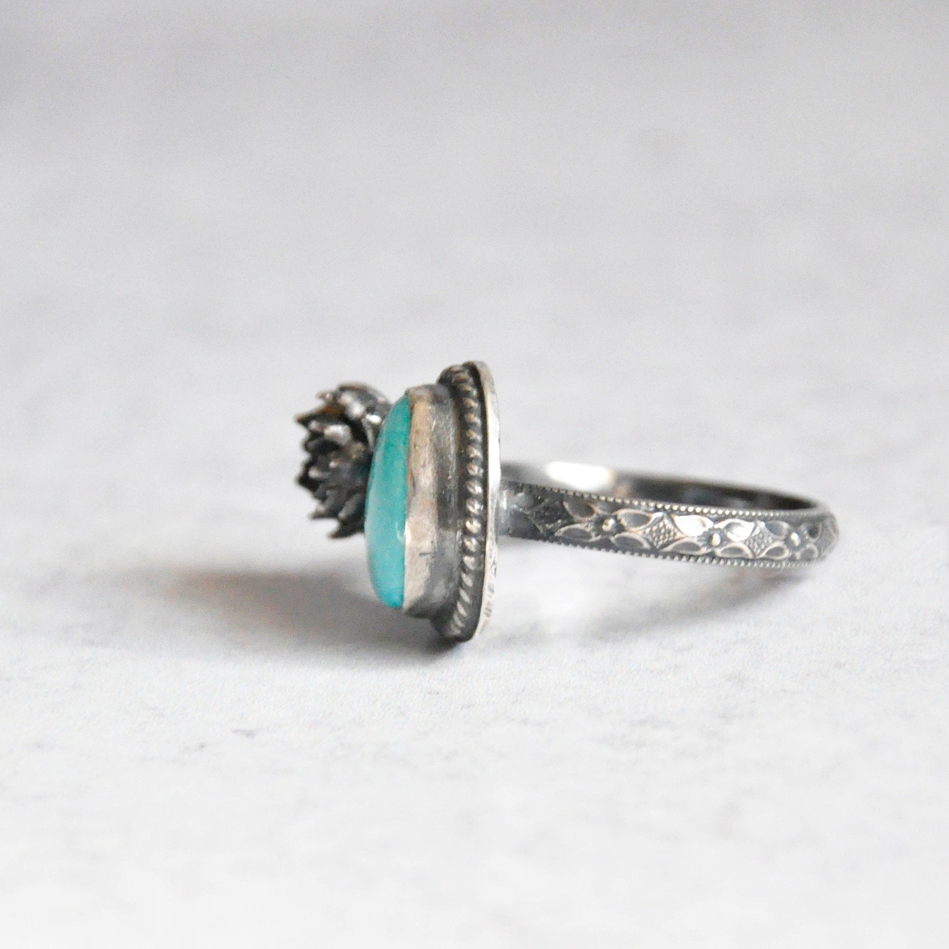 Turquoise with a casted succulent bloom. Sterling silver is patinaed for a weathered + antiqued look. Set in an hand forged bezel with twisted accent.