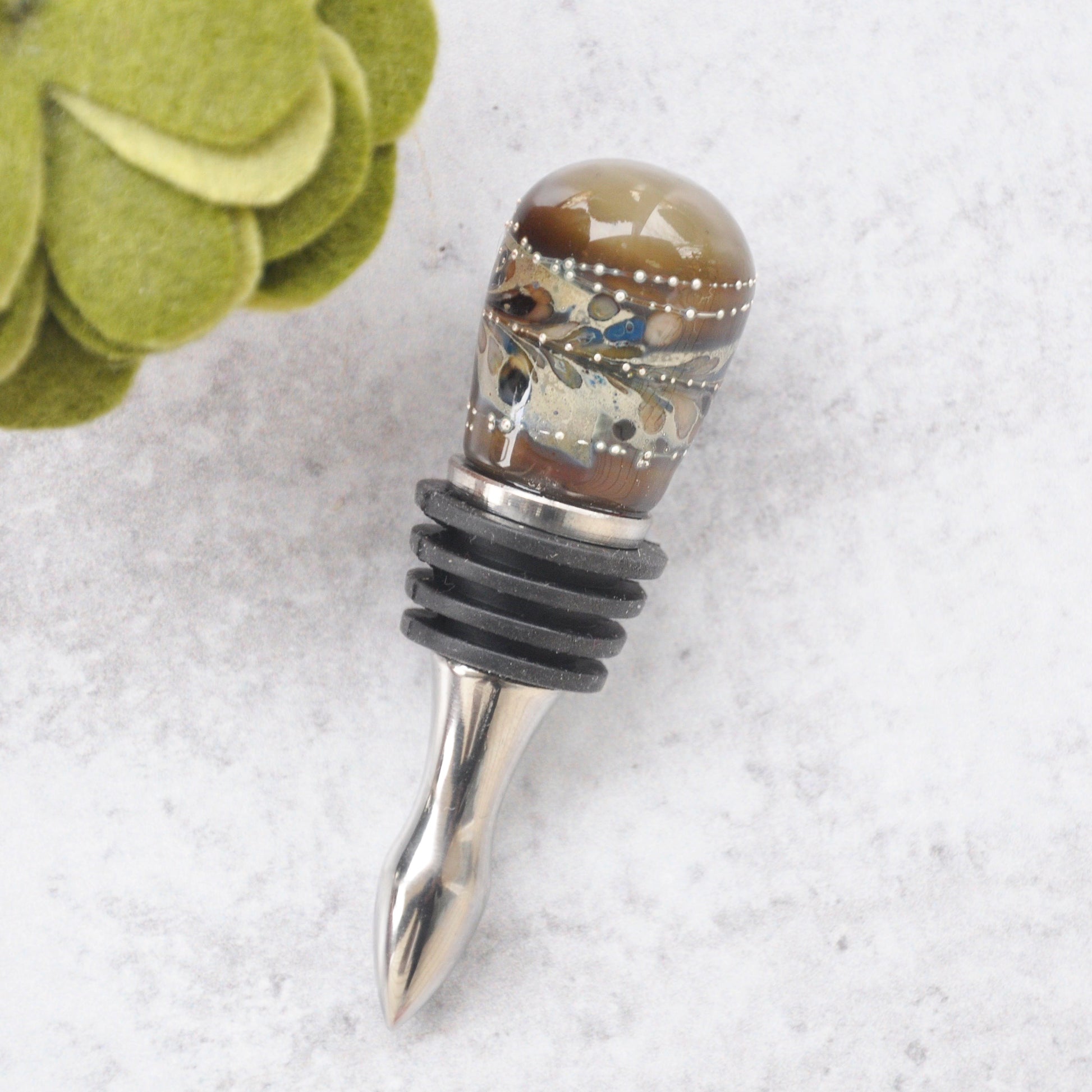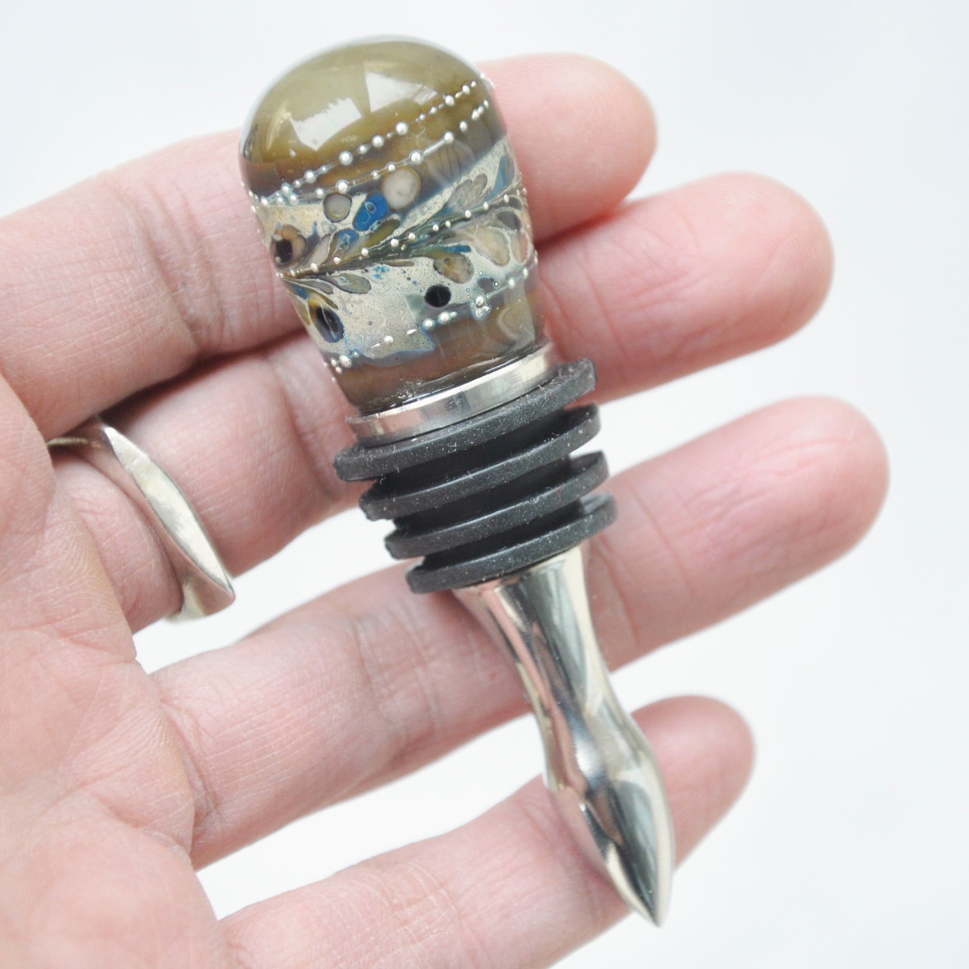 Handcrafted flamework glass was added to a stainless steel winestopper to create a unique, one of a kind gift. The glass was made by me, in home studio, using a torch and high quality glass rods. Each piece of glass have been annealed to add hardness and durability.