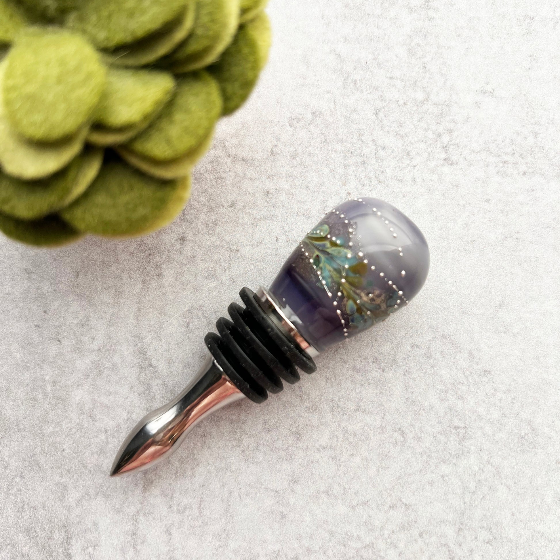 Handcrafted flamework glass was added to a stainless steel winestopper to create a unique, one of a kind gift. The glass was made by me, in home studio, using a torch and high quality glass rods. Each piece of glass have been annealed to add hardness and durability.