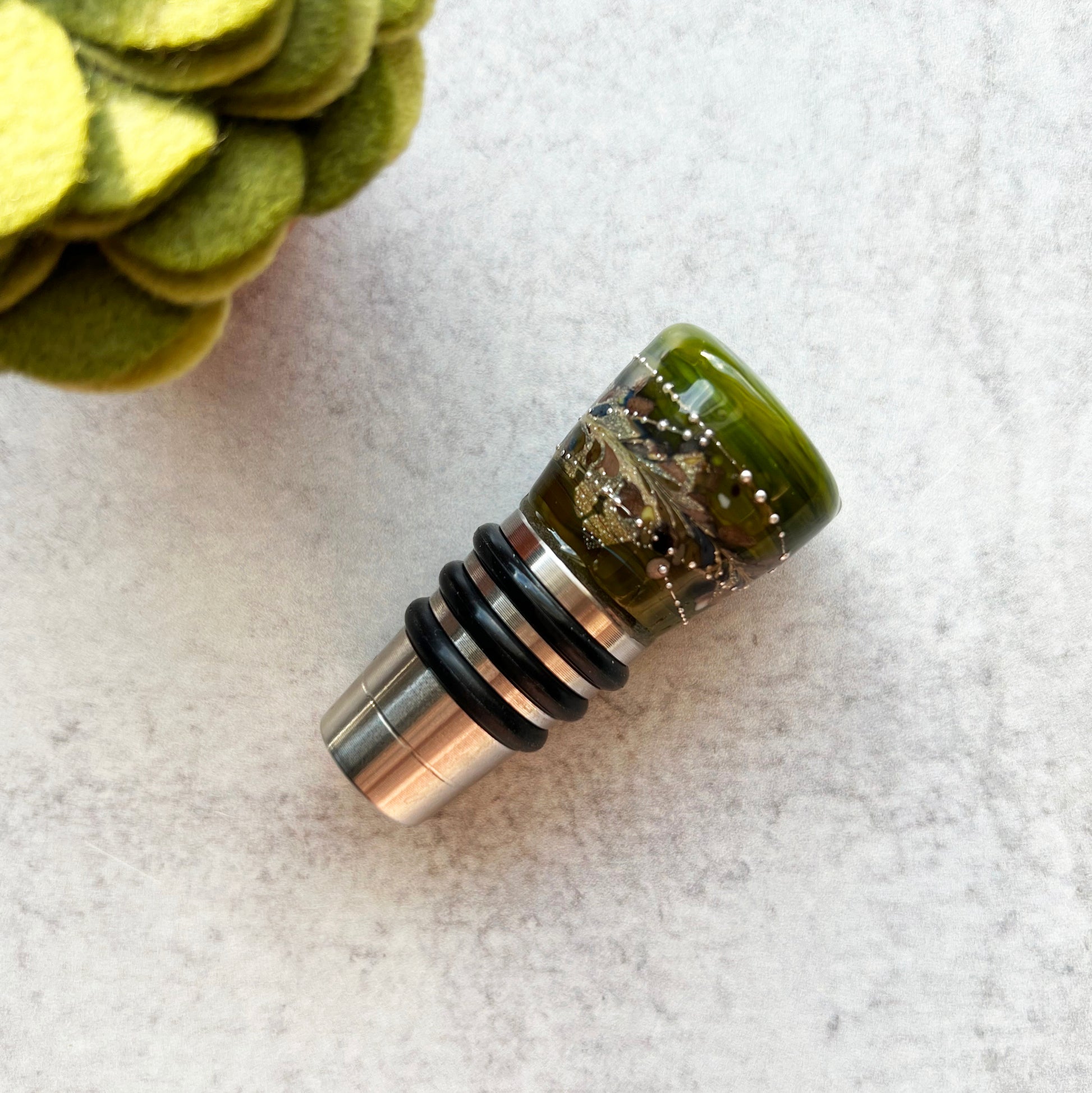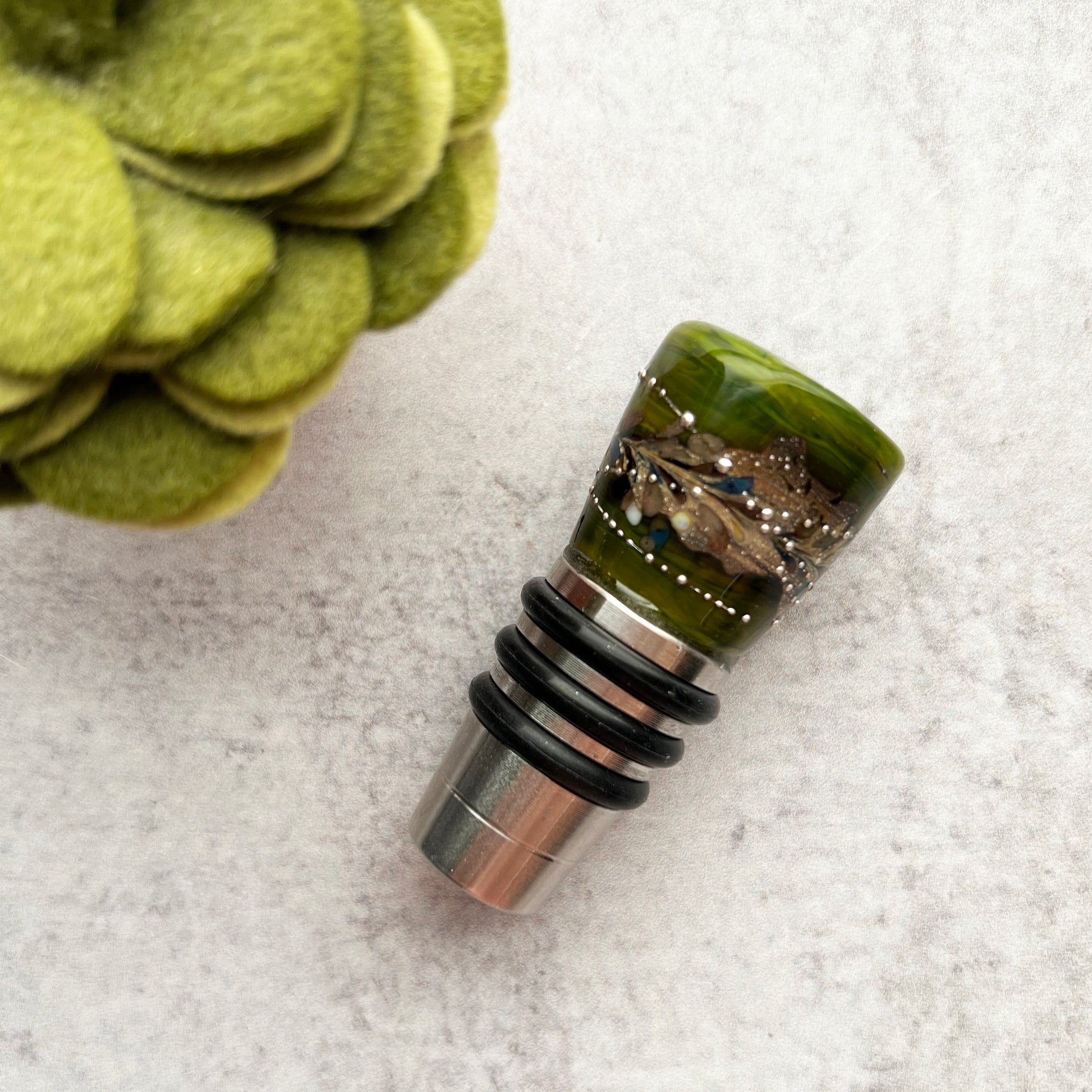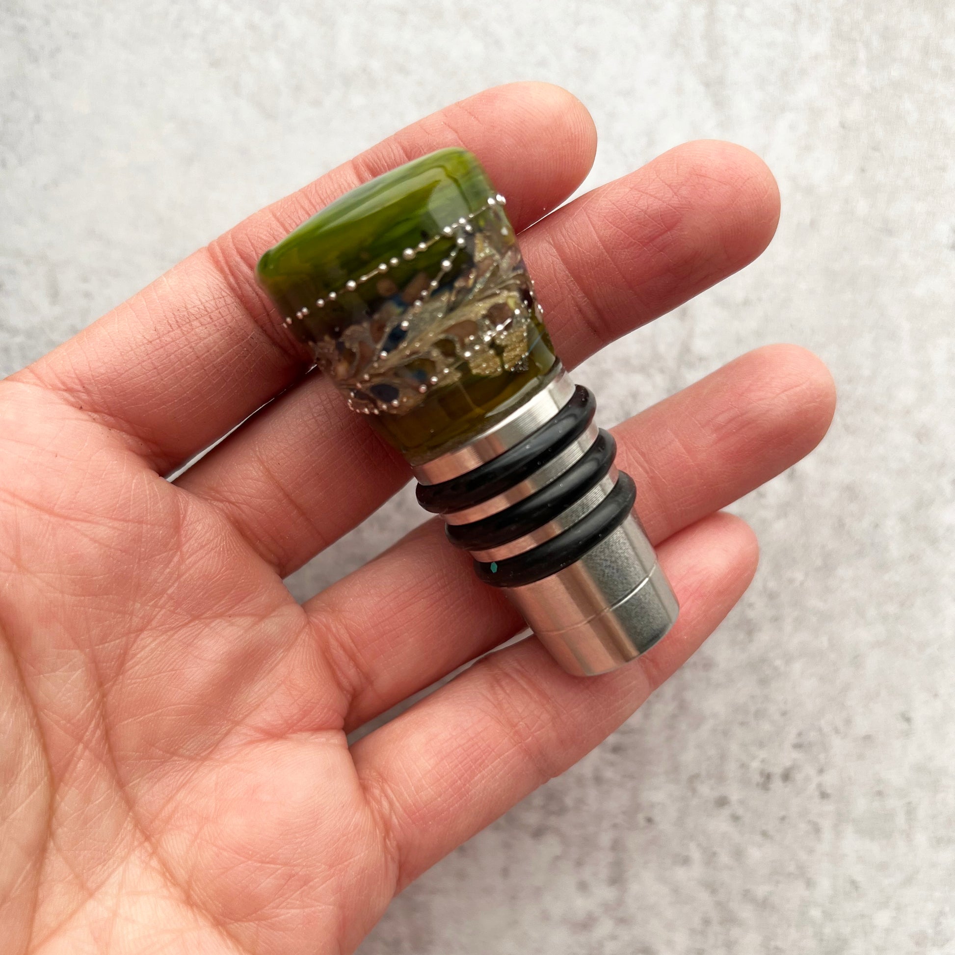 Handcrafted flamework glass was added to a stainless steel whiskey stopper to create a unique, one of a kind gift. The glass was made by me, in home studio, using a torch and high quality glass rods. Each piece of glass have been annealed to add hardness and durability.